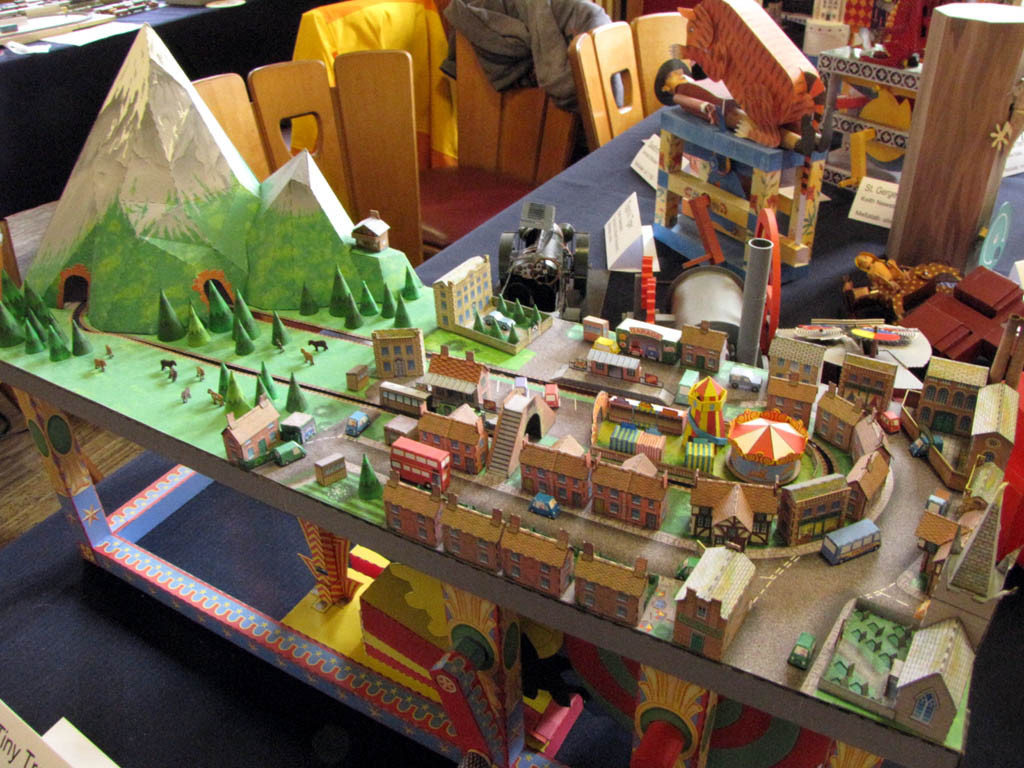 Die Ausstellung ist erfolgreich gelaufen, jetzt zeige ich noch schnell, was es so an Eisenbahn zu sehen gegeben hat! Das größte Exponat hat uns dankenswerter Weise die Bayernbahn GmbH direkt vor die Tür gestellt - dafür habe ich einen [url=https://f.z-freunde-international.de/viewtopic.php?t=19114]gesonderten Beitrag[/url] aufgemacht. :mrgreen: (War allerdings auch aus Blech und nicht Karton :o ) 1:45/Spur 0, der Gläserne Zug, eine Münchner S-Bahn und ein Bayerischer Schnellzug: [attachment=5]IMG_6800.JPG[/attachment] [attachment=4]IMG_6802.JPG[/attachment] [attachment=3]IMG_6880.JPG[/attachment] Mein ganz persönlicher Favorit ist die Kompaktanlage "Tiny Train Set" von Cool4Cats mit Automatikbetrieb und Sound! [attachment=2]IMG_6856.JPG[/attachment] [attachment=0]IMG_6866.JPG[/attachment] [youtube]http://www.youtube.com/watch?v=ags-z-goa_A[/youtube] Trevithick's Locomotive bewegt sich beim Rollen schön mit [attachment=1]IMG_6859.JPG[/attachment]