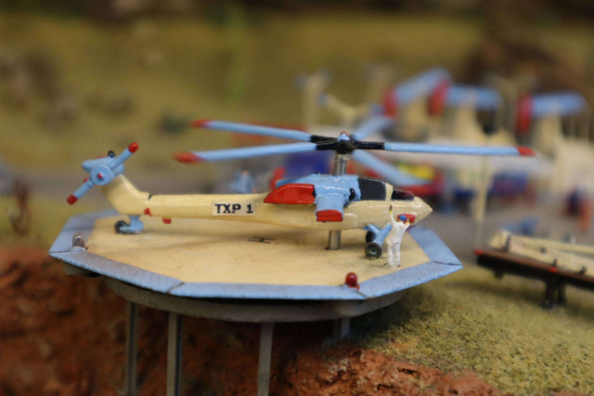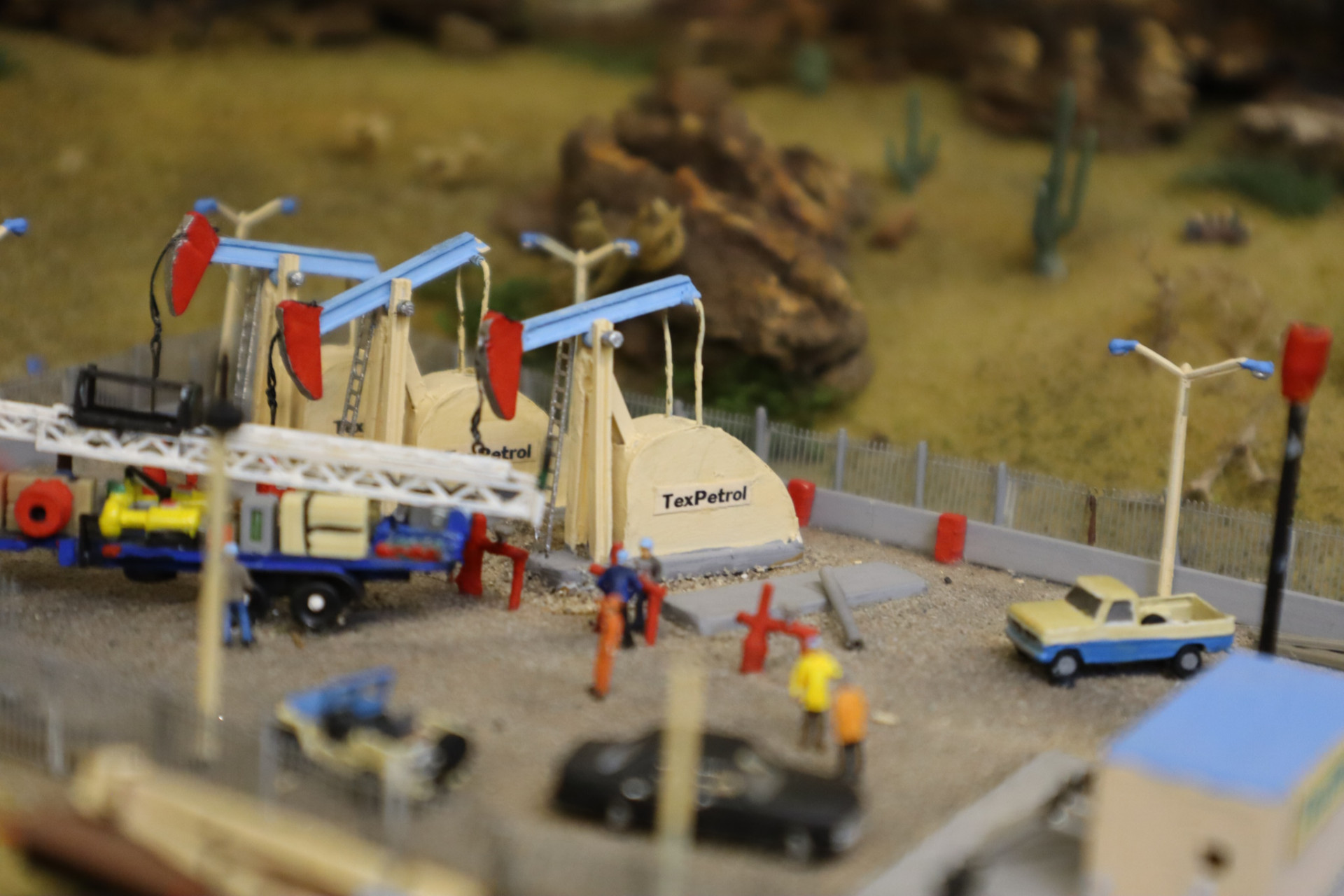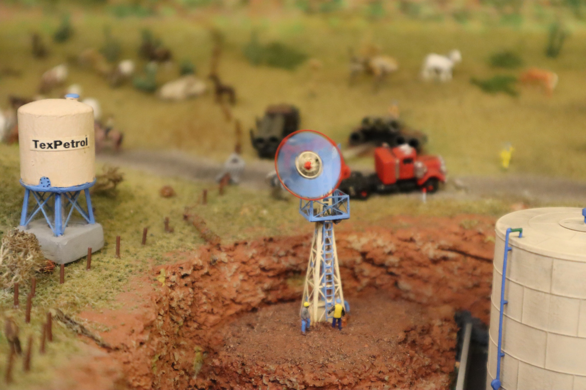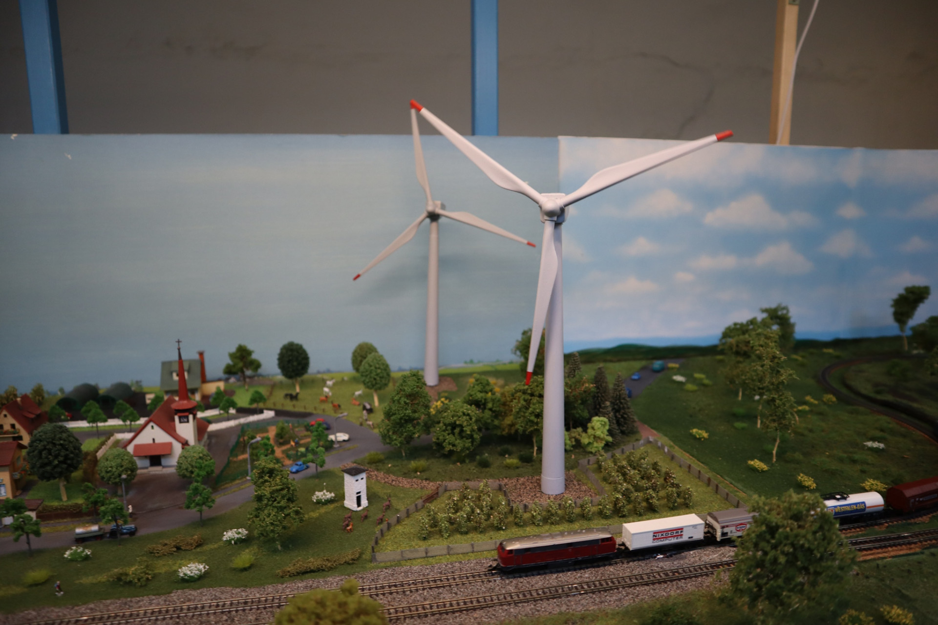 das US-Windrad auf der US-Anlage fand ich besonders klasse. Sehr schön zu sehen ist auf dem Foto wie schnell es sich dreht, dabei wurde es von hinten permanent mit Luft angeblasen. Eine feine Injektionsnadel zuerst gar nicht zu sehen brachte die die Luft auf die Schaufeln vom Windrad. Ich vermute mal das eine Aquarium-Luftpumpe hinter der auch sonst schönen Anlage die Luft erzeugte. Jedenfalls eine sehr gute Idee und klasse umgesetzt mit Steuerluft zu arbeiten.