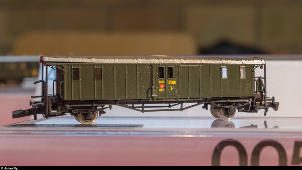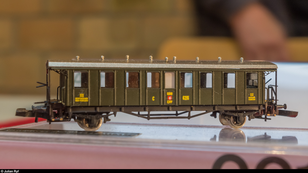 Erstaunlicherweise (er war die letzten drei Jahre auf der Ausstellerliste, war aber nie da) war Herr Sargenti anwesend und hatte seine SBB-2-Achser in Messing dabei - und das gleich in 5 verschiedenen Ausführungen.
