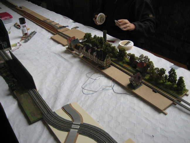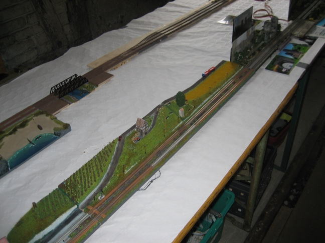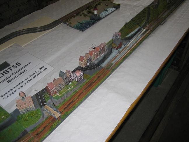Wir haben es geschafft, eine mehr als 6 m lange doppelspurige Strecke aus den Stammtischbrettchen zusammenzustellen und auch (nach ein paar kleinen Anfangsschwierigkeiten) zu betreiben.