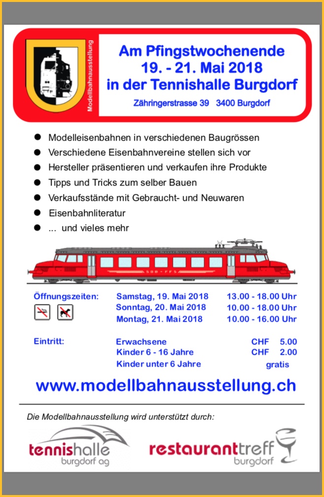 Liebe Z-Freunde, wie alle zwei Jahre findet auch diese Pfingsten wieder unsere Modellbahn Ausstellung in der Tennishalle in Burgdorf bei Bern statt.