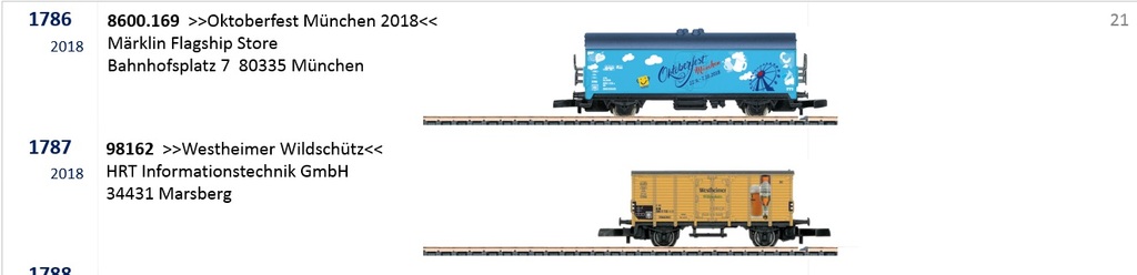 Ja, der ENGEL ist schon seit einiger Zeit im Werbemodelle-Katalog auf der Sammler-Seite der ZFI zu finden und der Oktoberfestwagen 2018 wird mit Miba-Nr. veröffentlicht, sobald er von Märklin ausgeliefert wurde: https://www.maerklin-store-muenchen.com ... rmodell-2/