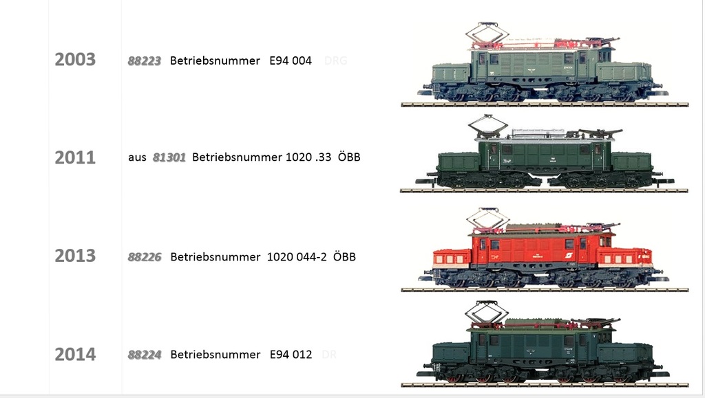 Du bist zwar noch bei E-Loks, aber wie wirst Du das Basismodell benennen bei der Ludmilla? Die erste Einzellok war 88131, aber zuerst erschienen und angekündigt war die Ludmilla im Zugset 81450.