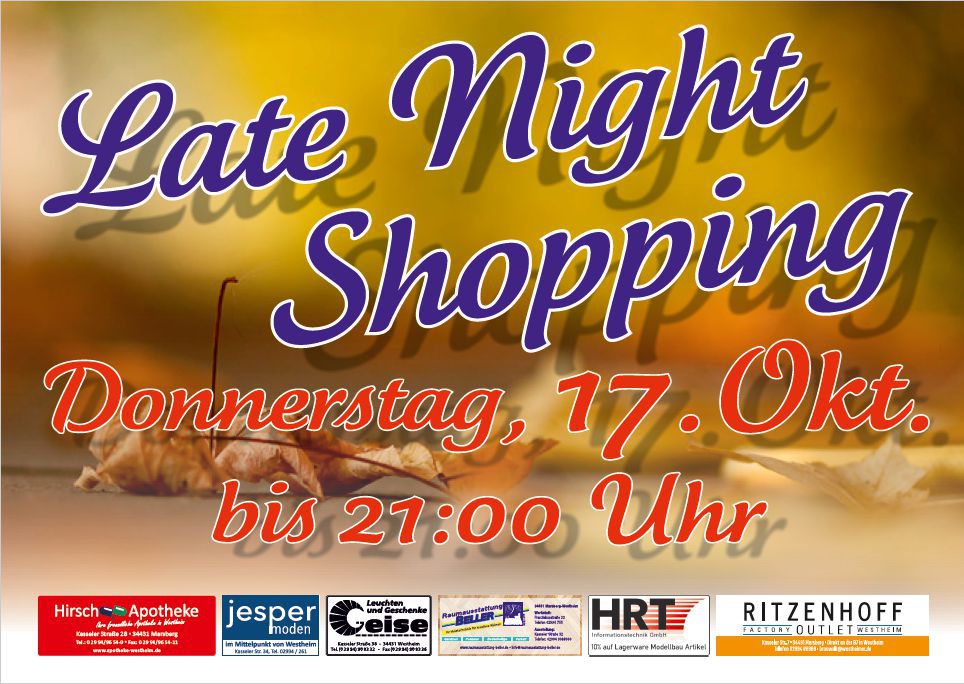 Der Förderverein in unserem kleinen Örtchen hat die Aufgaben des ehemaligen Gewerbevereins übernommen und hat am 17.10.2019 ein Late Night Shopping in den Kalender geschrieben. Als Ortsansässige Firma nehmen wir selbstverständlich Teil, obwohl ich mir nicht sehr viel für uns von der Aktion erwarte, da unsere Kunden ja eigentlich eher überregional im Land verteilt sind. Evtl. möchte aber doch jemand die Chance nutzen um mal in Ruhe ein Schwätzchen mit mir zu halten. Ab 17 Uhr dürfte das normale Tagesgeschäft durch sein und bis 21 Uhr wäre Zeit für den ein oder anderen Plausch. Wir führen auch HO Artikel. Da gibt es vielleicht etwas um evtl. die Kinder/Enkel auf Weihnachten für unser schönes Hobby zu begeistern. Zusätzlich besteht die Möglichkeit, im benachbarten Ritzenhoff Outlet noch das eine oder andere Weihnachtsgeschenk für die Gattin zu erwerben oder die heimischen Getränkevorräte mit verschiedenen Sorten leckeren Westheimers aufzufüllen. Es wäre auch noch Moden Jesper zu erwähnen, die ebenfalls an der Aktion teilnehmen.