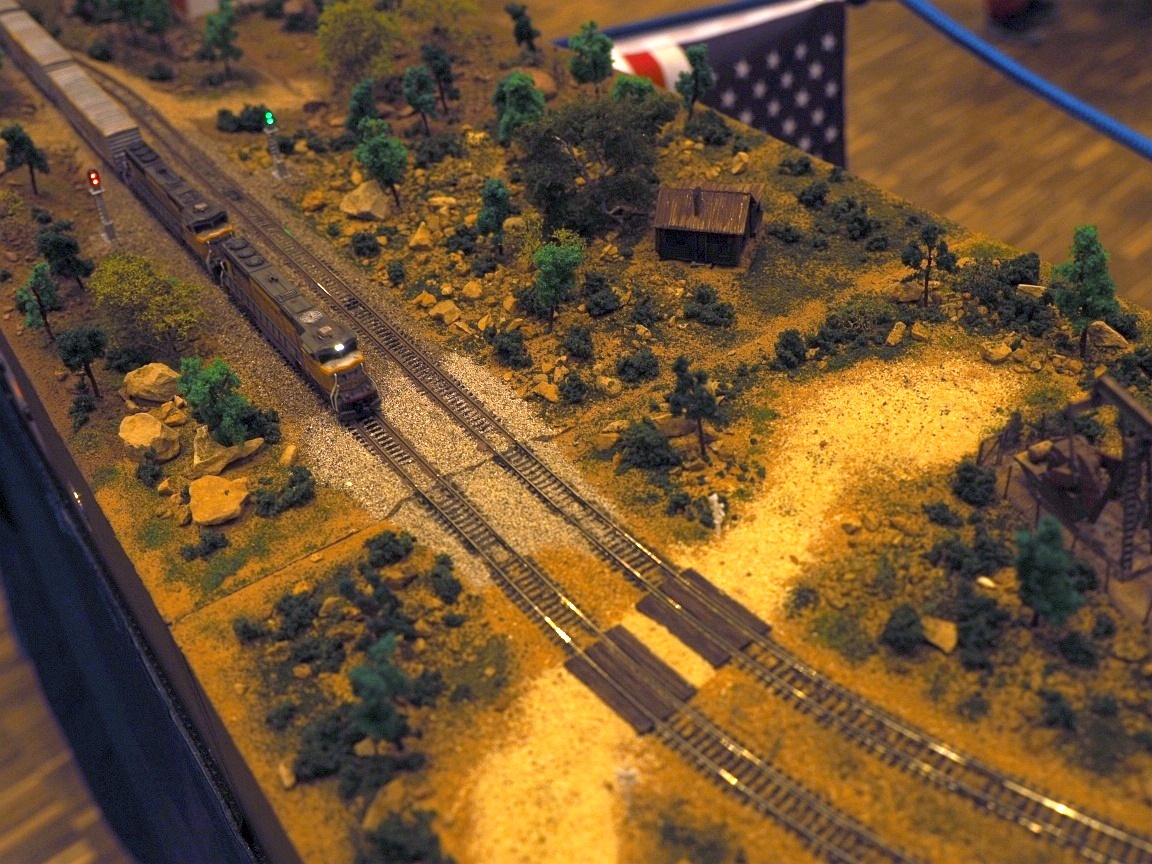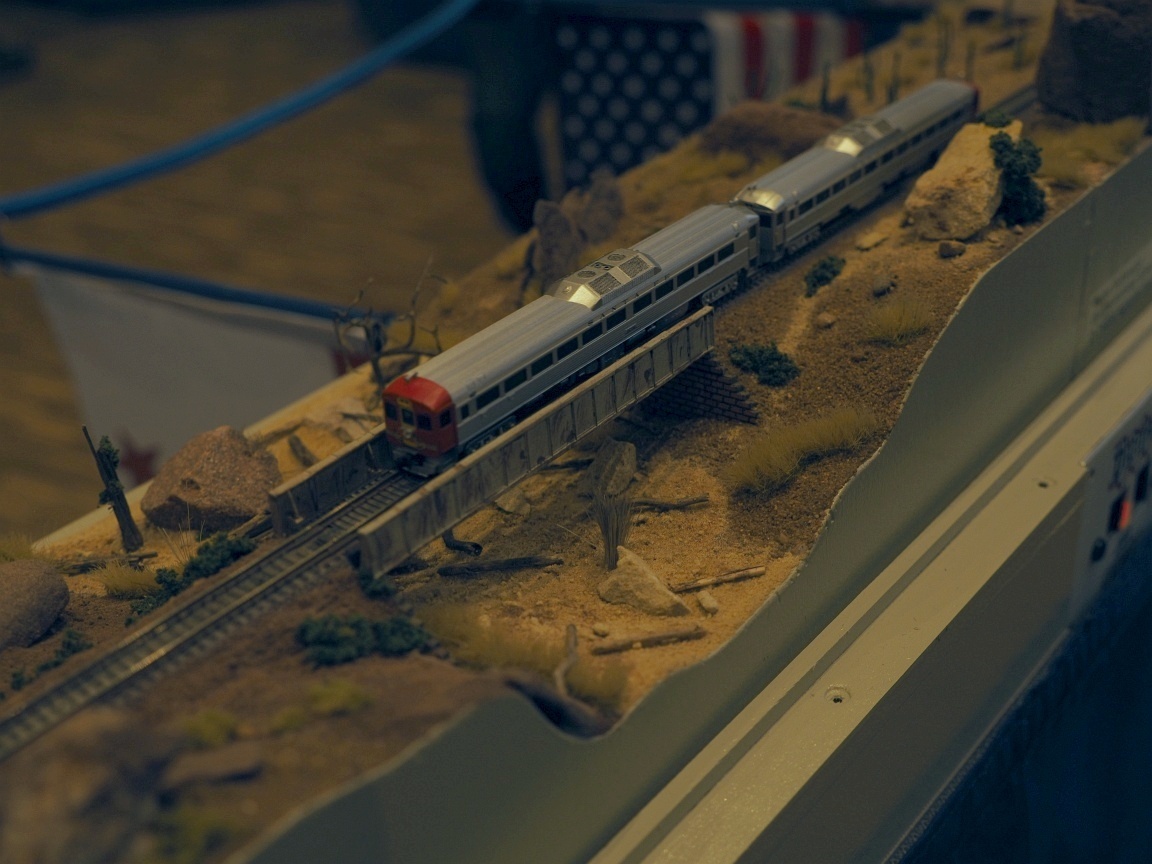 neben den vielen großartig gestalteten Modulen gab es auch weitere echte Highlights: Eines war ein über 7 Meter langer Zug gezogen von 4 SD70 der ATSF und 62 Centerbeam Wagen unterschiedlicher Bahngesellschaften, natürlich beladen. Ja das geht nur in Z.