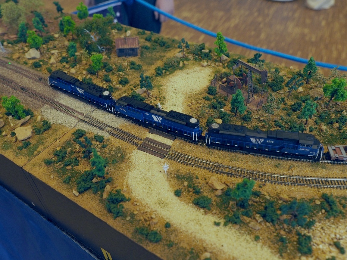 neben den vielen großartig gestalteten Modulen gab es auch weitere echte Highlights: Eines war ein über 7 Meter langer Zug gezogen von 4 SD70 der ATSF und 62 Centerbeam Wagen unterschiedlicher Bahngesellschaften, natürlich beladen. Ja das geht nur in Z.
