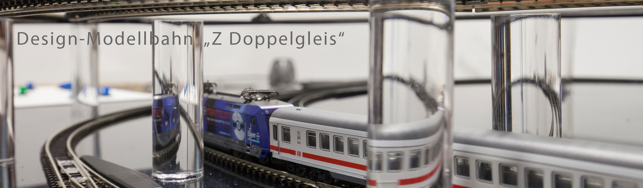 Die Modellbahnskulptur "Z Doppelgleis" bittet auf zwei getrennten Stromkreisen auch längeren Zügen genügend Auslauf. Der Gleisplan ist raffiniert, so dass der Zug beim Verlassen des oberen Bahnhofs von der nicht vermuteten Seite in den unteren Bahnhof einfährt. Die Skulptur ist perfekt verarbeitet. Alle 14 Bahnhofsgleise sind nahezu unsichtbar einzeln ein- und ausschaltbar, so dass ganze Zuggarnituren zum abwechslungsreichen Spiel oder zur Präsentation darauf abgestellt werden können. Siehe auch das Viedeo: hier nochmals der Link: