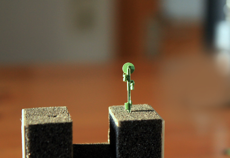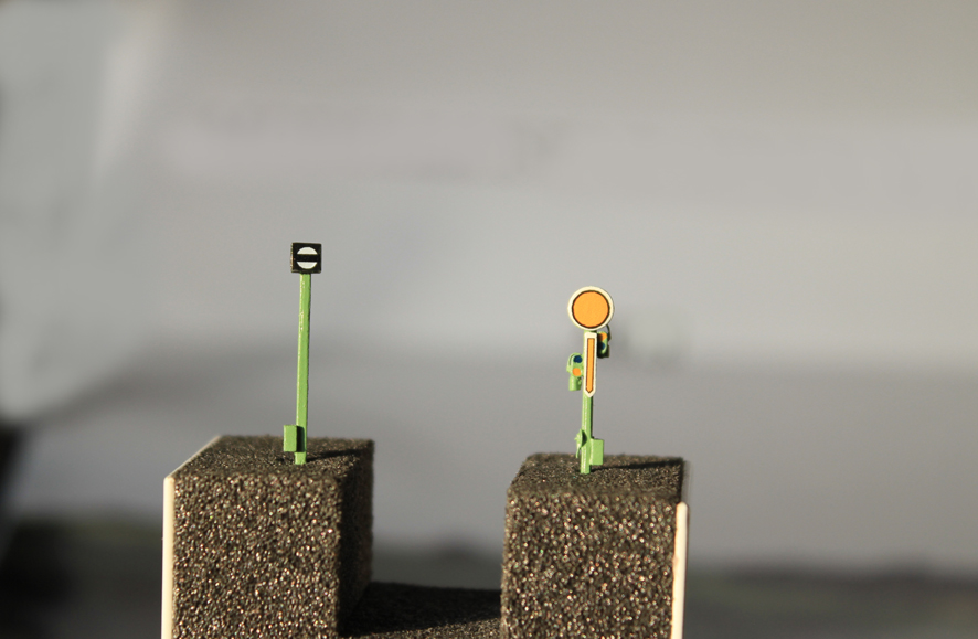 Weiterhin seht Ihr die ersten der statischen Metallsignale, von denen eine kleinere Stückzahl sofort lieferbar ist. Die Gleissperrsignale werden als Zweierpack geliefert, das Vorsignal gibt es einzeln. Kleines Loch bohren, einstecken oder kleben - fertig.