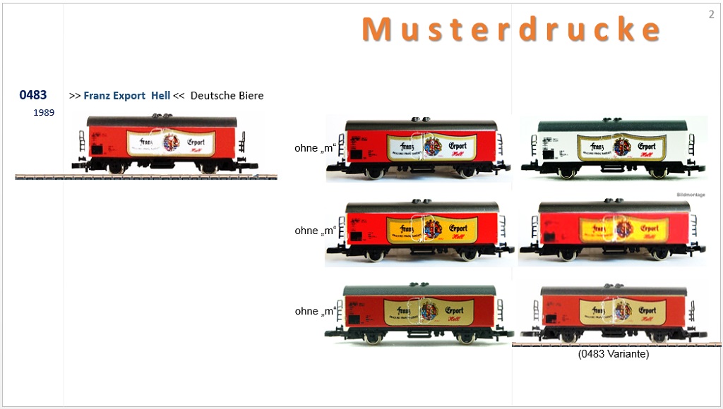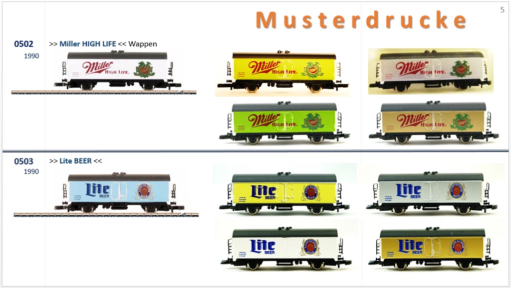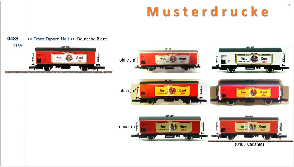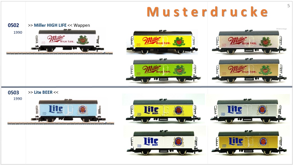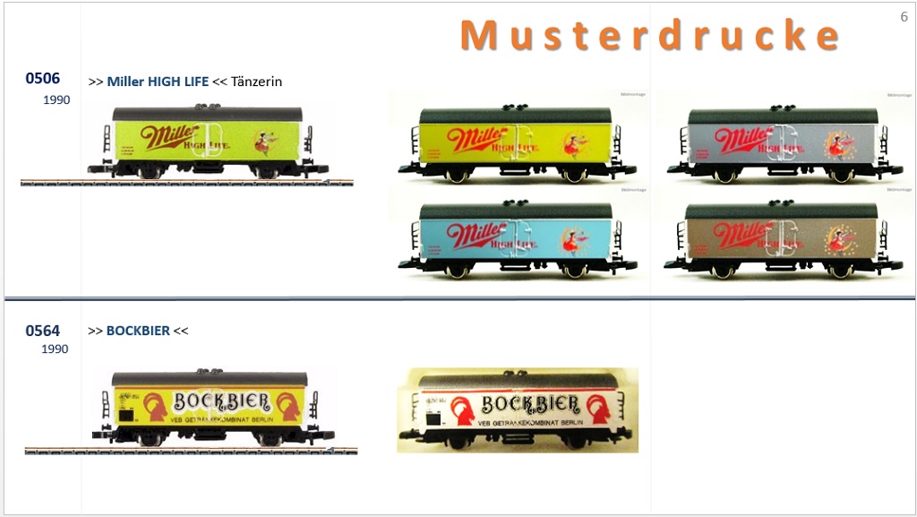 Märklin hat m.W. 1989 bis 1991 von einigen wenigen Wagen sogenannte Musterdrucke angefertigt, von denen der Auftraggeber eine Version aussuchen konnte, die dann in Produktion ging.