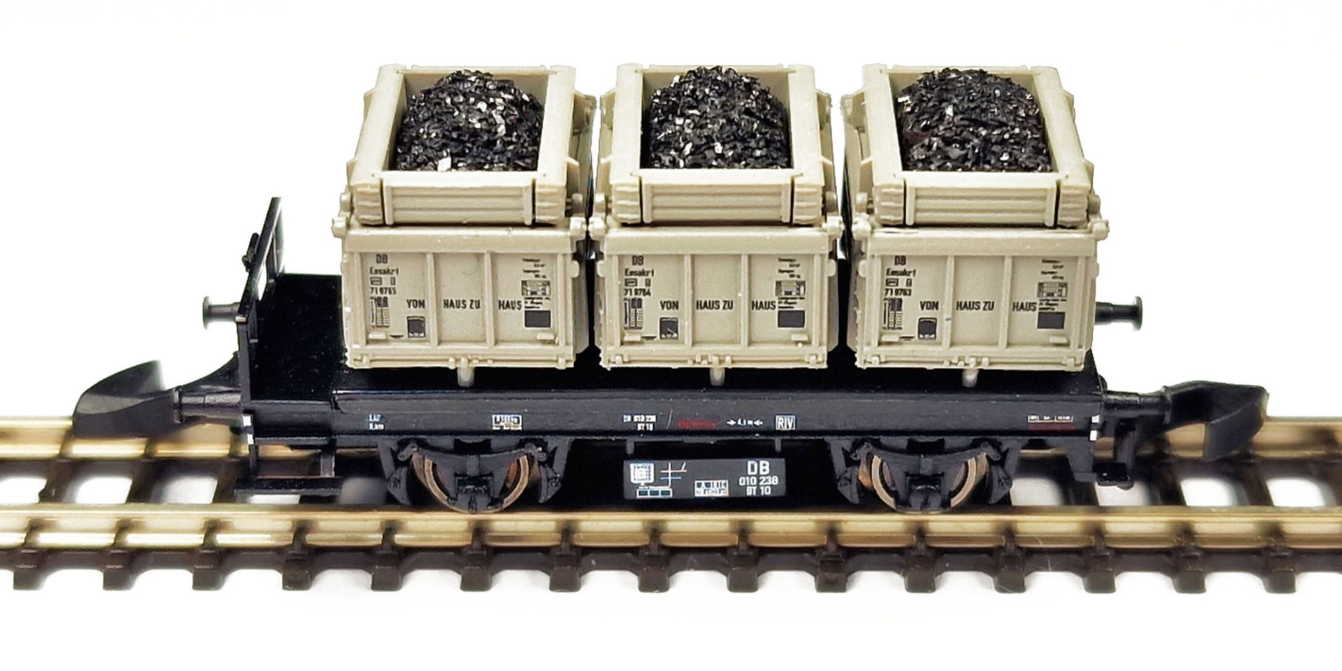 3 mm black polystyrene precisely cut on CNC machine is used as a base for these loads. It was a bit difficult to do a “reverse-engineering” of these unusual cars due to a conical shape of the ladles (one of which has also an irregular oval shape when viewed from the top), but after a number of precise measurements, I got perfect results – without any visible gaps.
