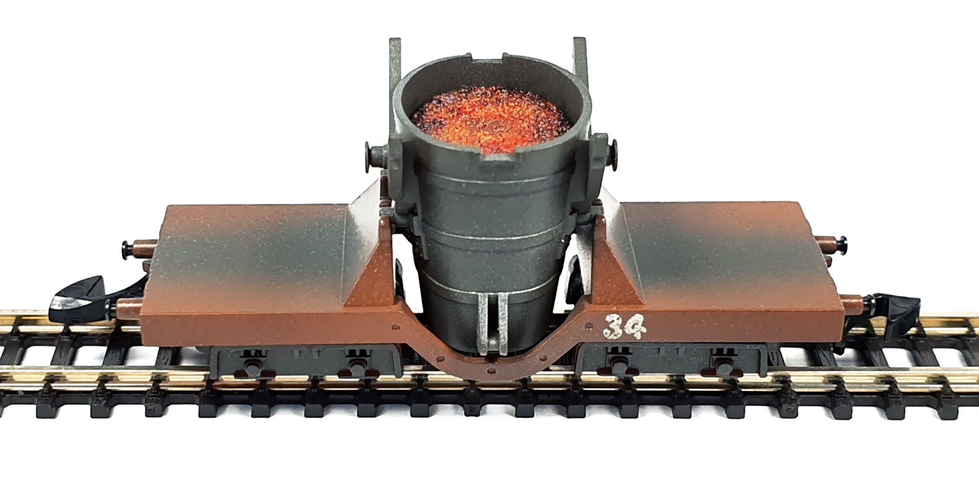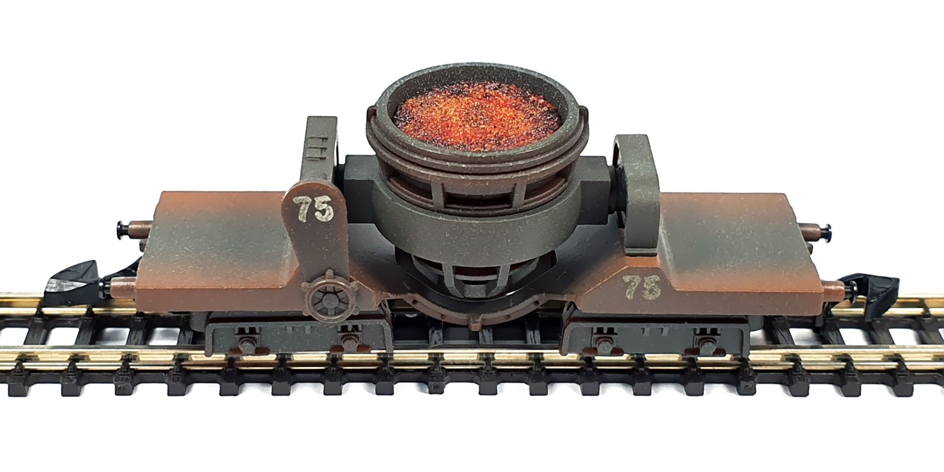 I developed unique load inserts – imitation of molten iron and slag for two types of Märklin Z scale metallurgical cars, ladle and slag ones offered in 86210, 86211, 86212, 86213 and 86214 sets. It was quite difficult to find a suitable method for implementation of such idea, but after numerous experiments, I came to the desired results.