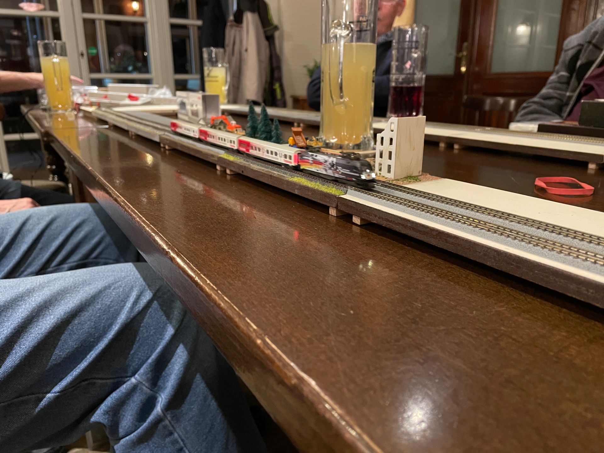 Wir bringen unsere Brettlesanlage mit, auf der analoge und digitale Loks fahren gelassen werden können. Das sieht dann zum Beispiel so aus: