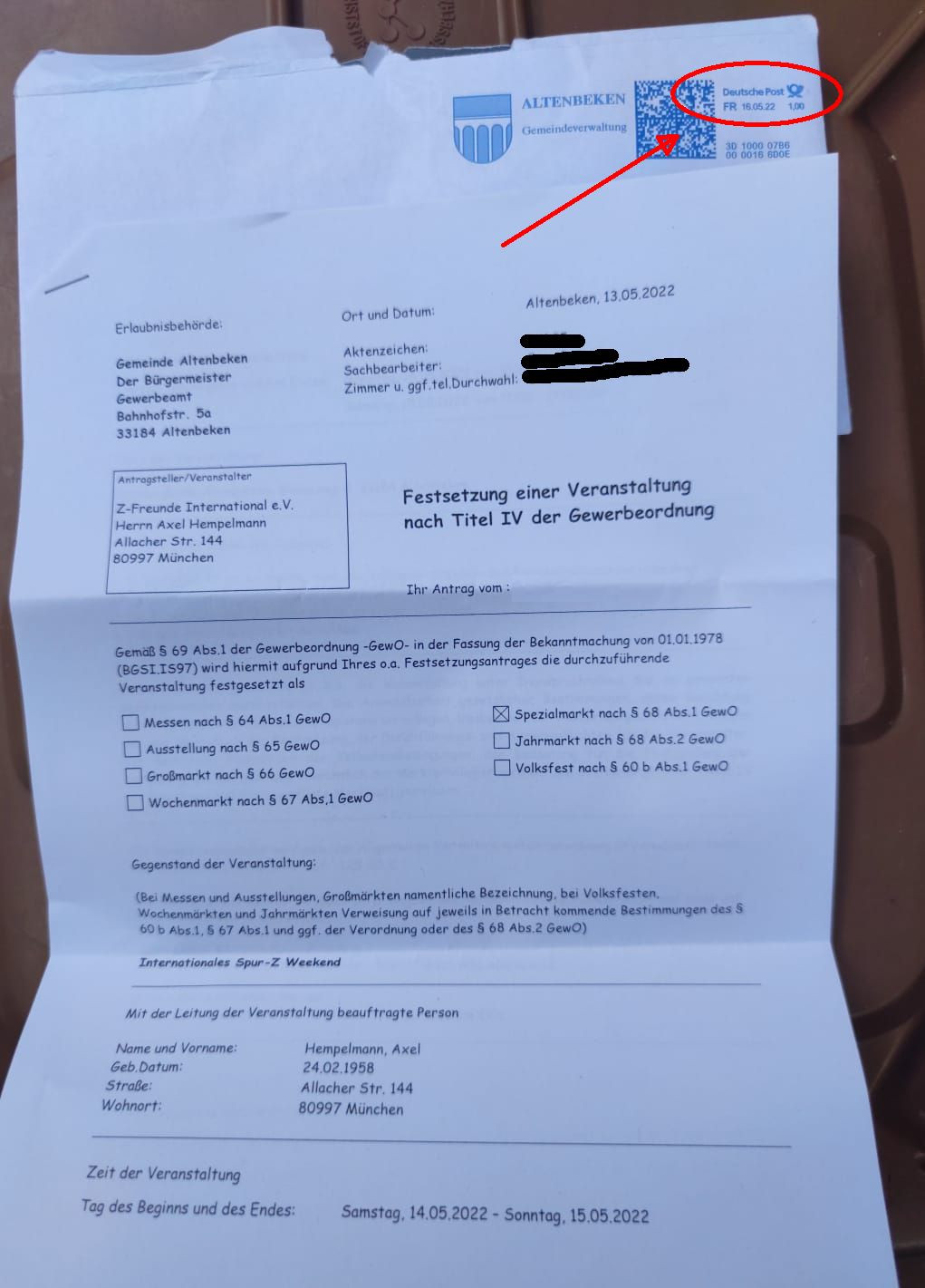 - der Brief trägt den Poststempel vom 16.(!).5.; also Montag nach dem Z-Weekend