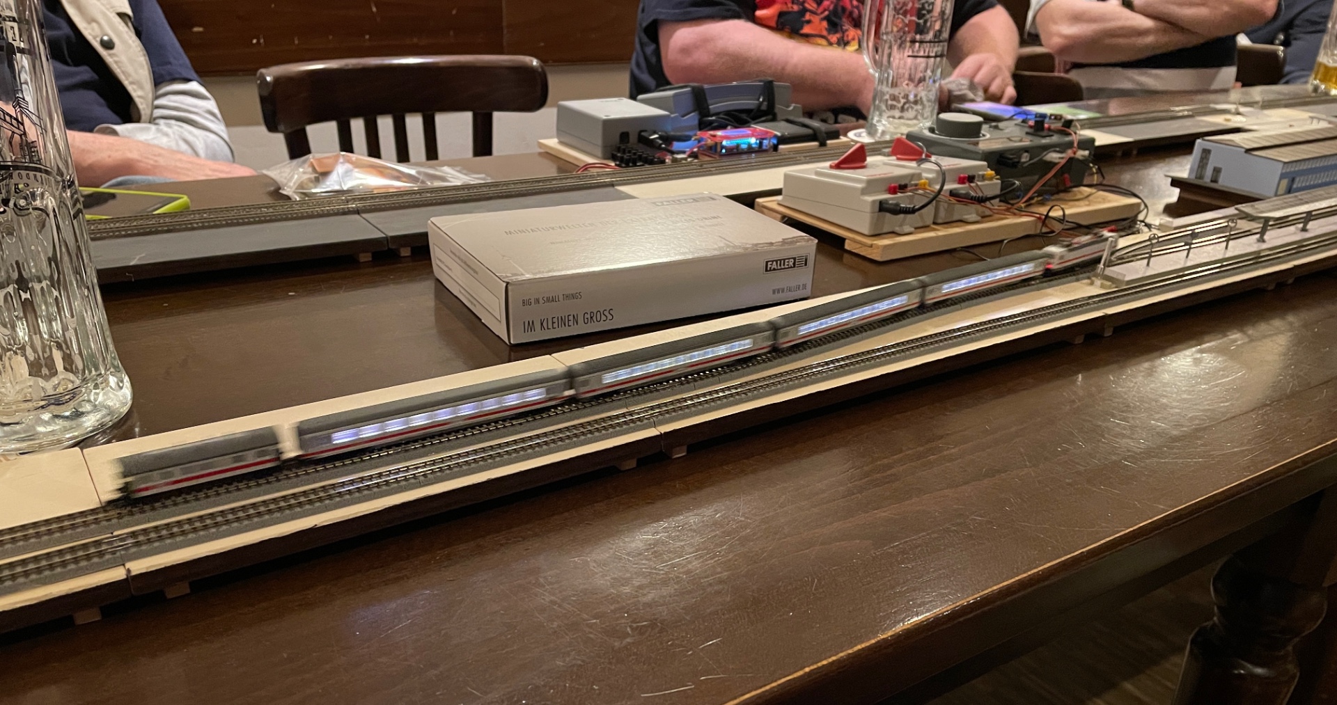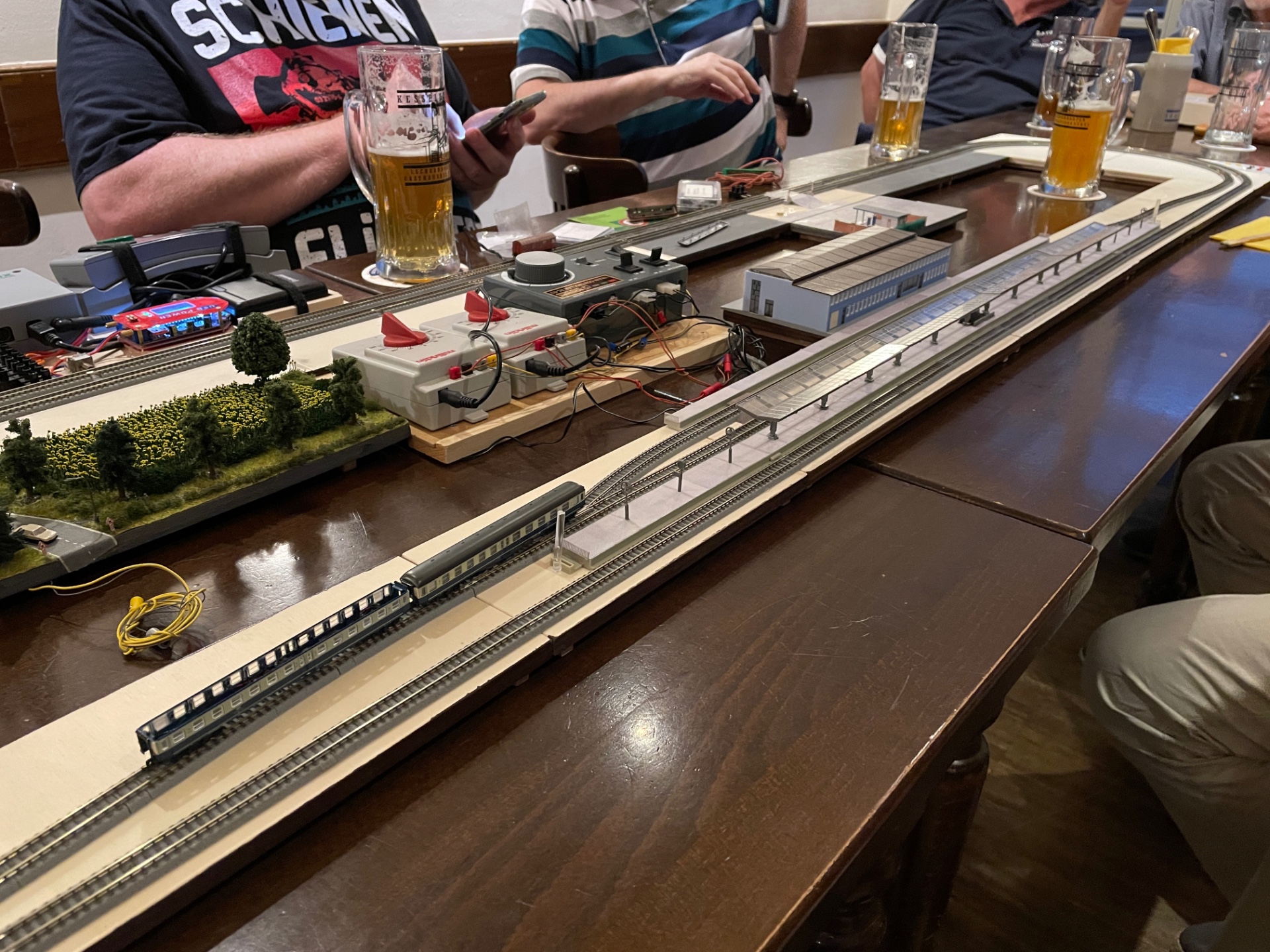 wenn Thomas dabei gewesen wäre, hätten wir noch einen Tisch mehr anbauen müssen und hätten dann fast in den Wintergartensaal hineingeragt, denn heute waren wir eine große Runde. Auf der Brettlesbahn kreisten heute kugelgelagerte Radstromabnehmer und eine IC-Garnitur mit Extrawagen für die 9-€-Ticketinhaber, die Gesprächsthemen waren sehr vielfältig: vom Sonnenblumen einpflanzen, Hintergründe, Oberleitungsbau, Bezugsquellen für Digitaldecoder, Bahnsteigdächer. Modellimmobilien wechselten ihre Besitzer und vieles mehr.