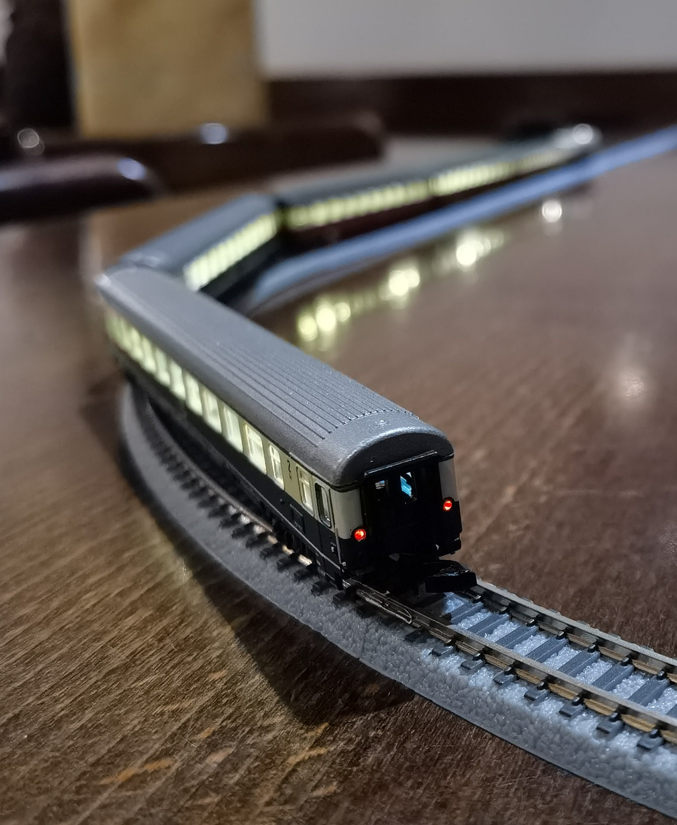 Da flackert im Betrieb nichts, ein anschließbarer (mitgelieferter) Pufferkondensator sorgt dafür - auch für langes Nachleuchten. Die Helligkeit ist mit einem Poti einstellbar. Ich setze die analogen Platinen im Digitalbetrieb ein, Einspeisung 12 V DC in die Gleisbox / Steuerung. Somit irgendwas um die 10,8V eff DCC am Gleis.