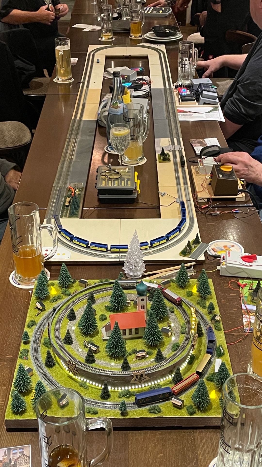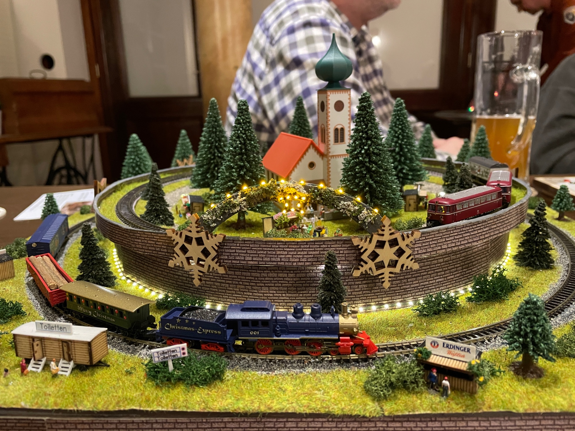 heute hatten wir wieder mal eine sehr kurzweilige Runde. Volker hatte seine neue Advents- und Weihnachtsanlage dabei, Auf der Brettlesbahn drehten ein Northlander, ein Roheisenzug, ein Schienenbus, diverse Dampfloks und ein Kohlezug ihre Runden. Auf Thomas´ Schienenkreis gab es ein Wettrennnen zwischen drei Zügen und den Vergleich zweier Turmtriebwagen.