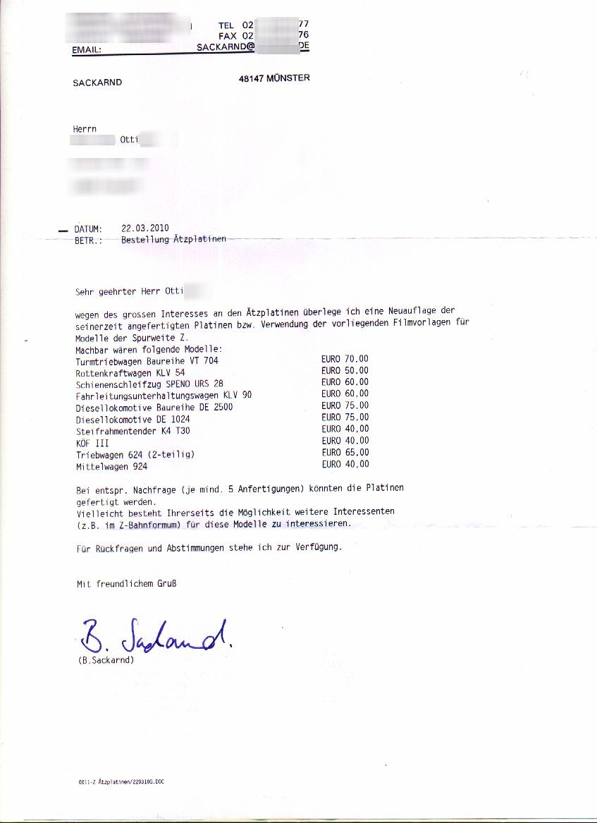 Ich meine, mich daran zu erinnern, dass die in dem Schreiben an Otti aufgeführten Bausäte das letzte Material in Z gewesen ist.