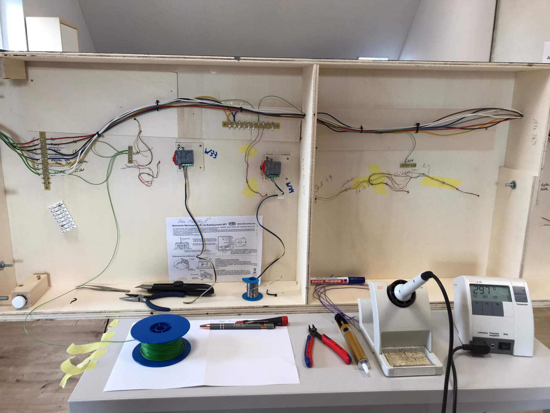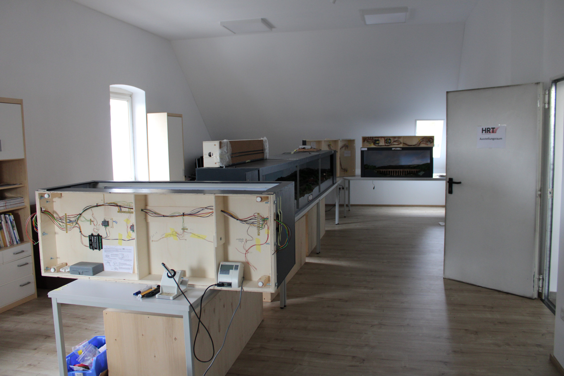 Der Ausstellungsraum zeigt sich am 19.03.2023 etwas unaufgeräumt, aber es wird gearbeitet. Die Anlage Diemeltal wächst zu einem L mit dem Posten 34 als Schenkel nach rechts. Das Modul Grottenberg wird sich an die 3 Module Diemeltal längs hinten (Ausfahrt Westheim Richtung Marsberg) anschließen. Grottenberg und das Schenkelmodul müssen noch digitalisiert werden. Später kann man dann die Anlage als Ganzes mit allen 5 Modulen á 140 cm betreiben (als L oder als lange gerade) oder auch einzeln die 3 Diemeltal Module, den Posten 34 und das Modul Grottenberg. So kann ich z.B. nach Bad Schwartau oder Zell mit Grottenberg oder Posten 34 fahren und brauche nicht 2 Mann und 2 Autos um die ganze Anlage mitzunehmen. Im TrainController haben wir dann jeweils Fahrpläne für alle Konstellationen. Weiterhin besteht die Möglichkeit, auf dem Innenkreis bei Bedarf auch analog zu fahren. Ich freue mich besonders darauf, wenn die zwei BR 44 mit Ihrem langen Güterzug auf dem Überholgleis in Westheim halt machen und von der BR 216 mit Ihrem Eilzug Aachen-Braunschweig überholt werden.