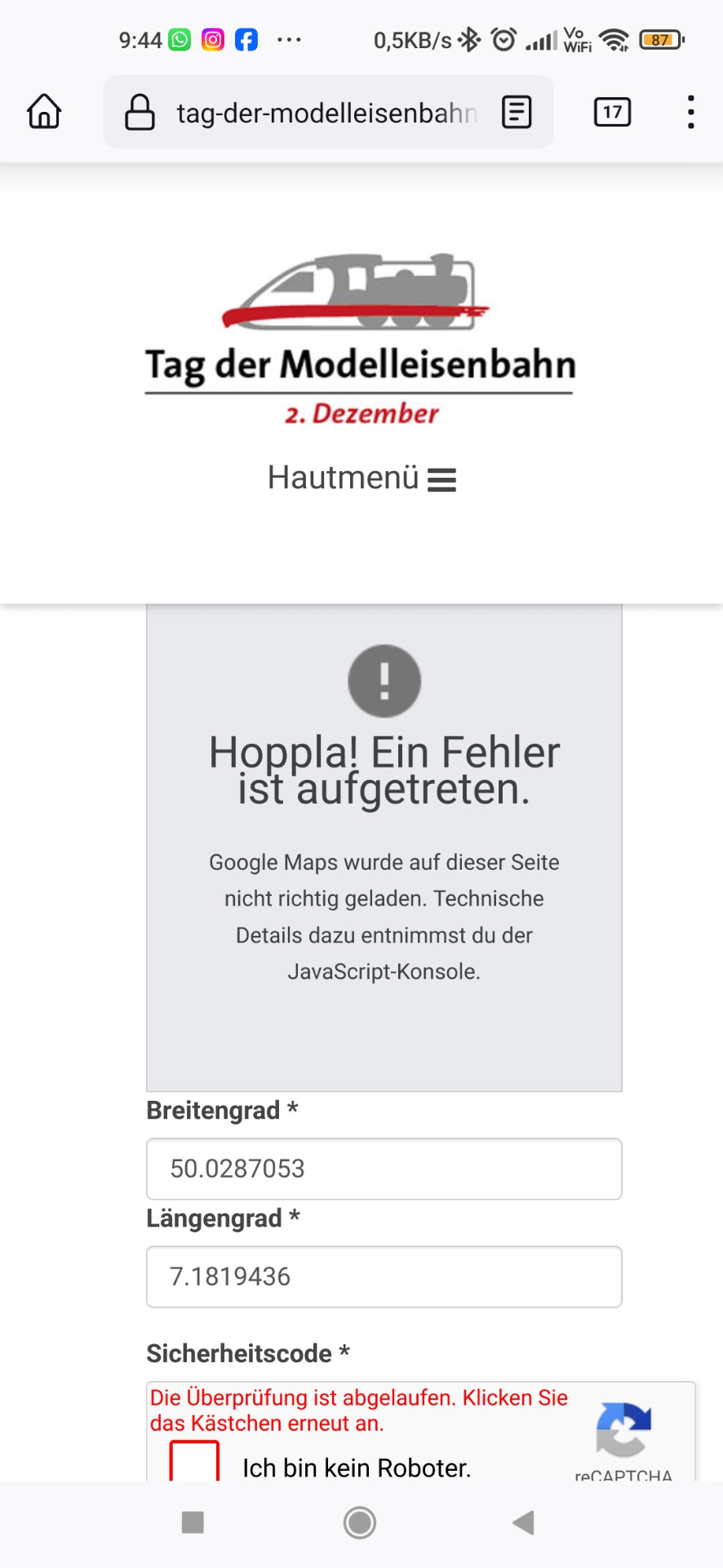 Dann taucht bei Eingabe der Koordinaten (die musste ich auch erst raussuchen; brauchen vermutlich diejenigen, die mit dem Schiff anreisen) eine Fehlermeldung auf: "Google Maps wurde nicht richtig geladen". Nach Eingabe des Captchas war die Beschreibung wieder weg. Nach erneuter Eingabe des Textes fehlte das hochgeladene Bild. Dann war das Captcha wieder verfallen...