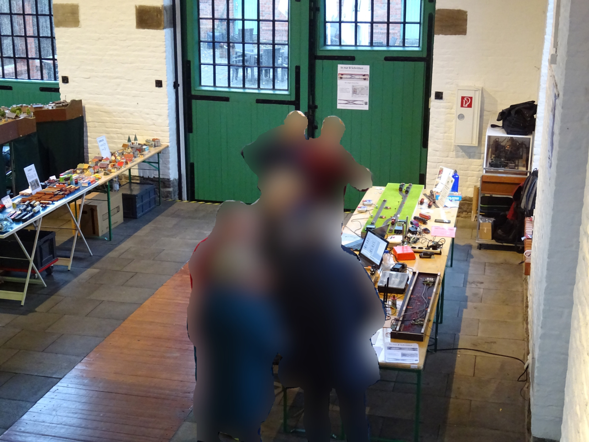 Ralf und wir (das sind meine Kinder und ich) stellen ja gemeinsam aus, wenn auch auf zwei getrennte Tische in unmittelbarer Nachbarschaft verteilt. Die Aufteilung ist zum einen der Räumlichkeit (Erreichbarkeit aller Anlagen und freie Durchgänge) geschuldet und der Tatsache, dass meine Kinder gern das beliebte "Bierdeckelbasteln" (Kinder dürfen kostenfrei einen Bierdeckel begrasen und gestalten; auf Wunsch erfahren sie Anleitung) wieder anbieten möchten. Durch den Freiraum schützen wir auch die Spur-Z-Exponate vor Klebstoff und losen Grasfasern.