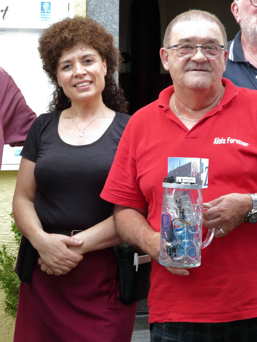 Stammtisch-Krug: Gruppenfoto mit Wirtin, Alois überreicht ihr den von ihm gebauten Stammtisch-Krug.