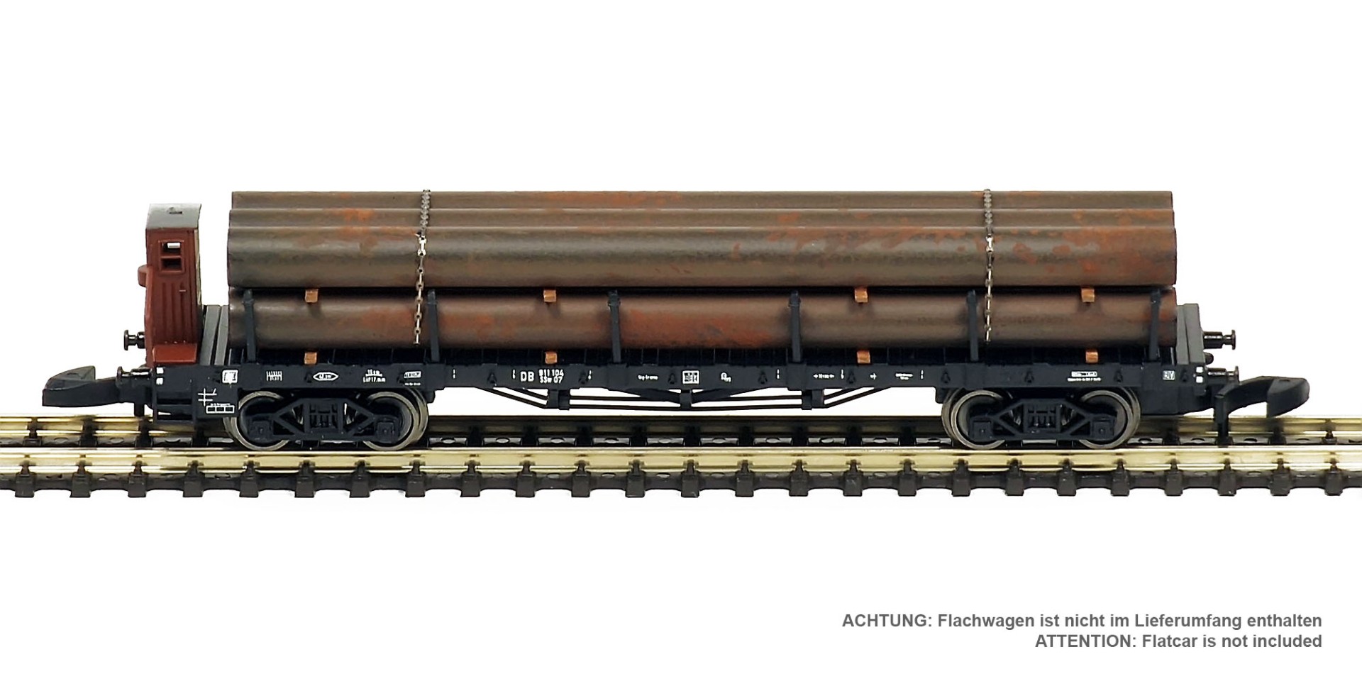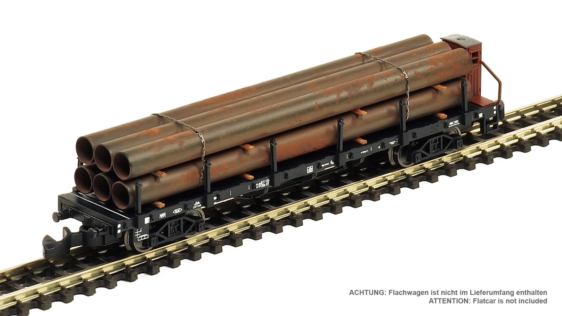 The pipes are arranged in 6-piece stacks and tied with dark photo-etched nickel silver chains. Stoppers at the bottom prevent the load insert from sliding off the flatcar during motion.