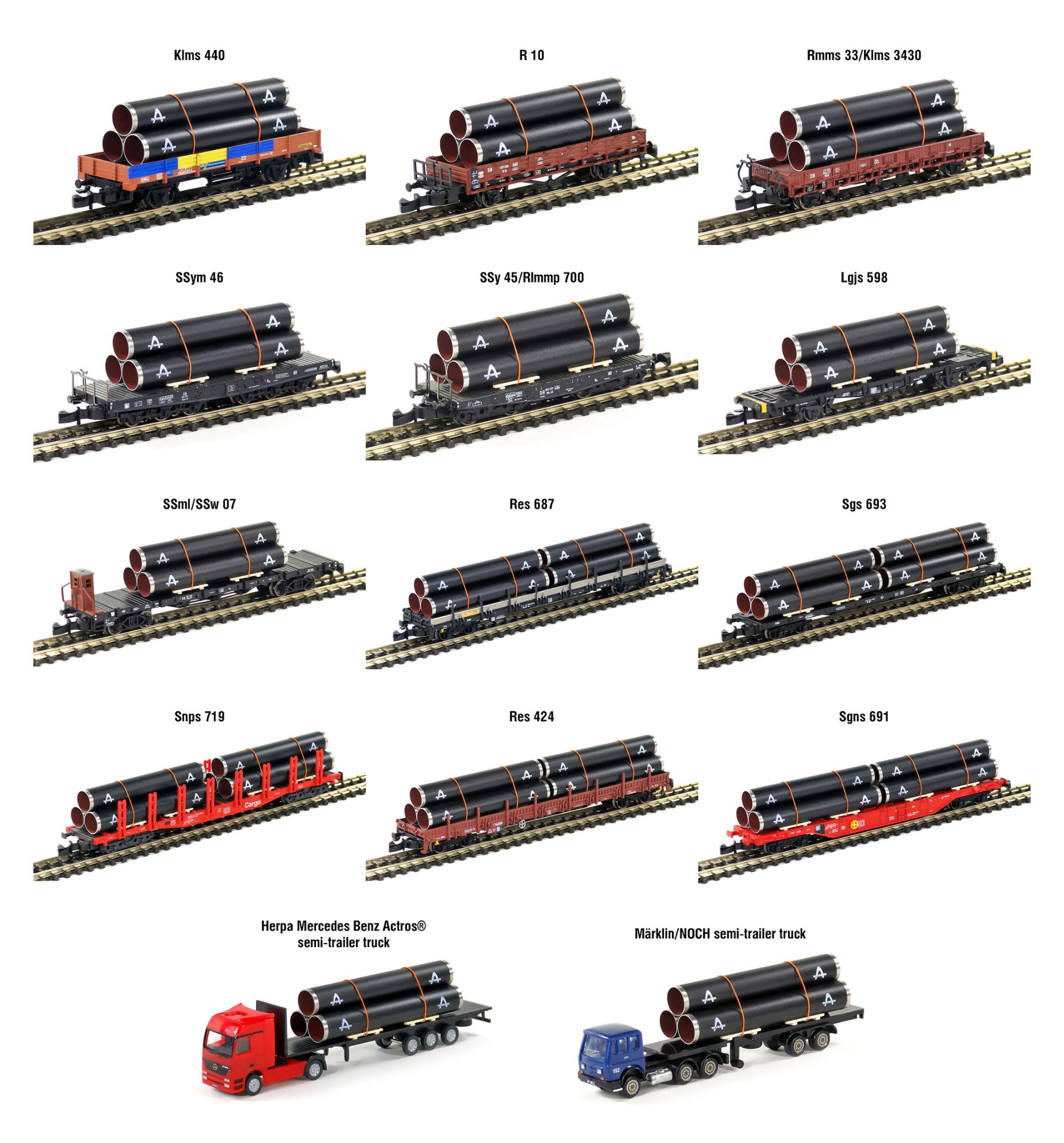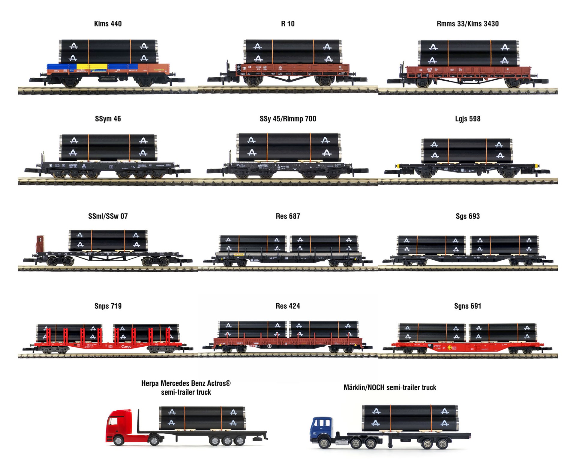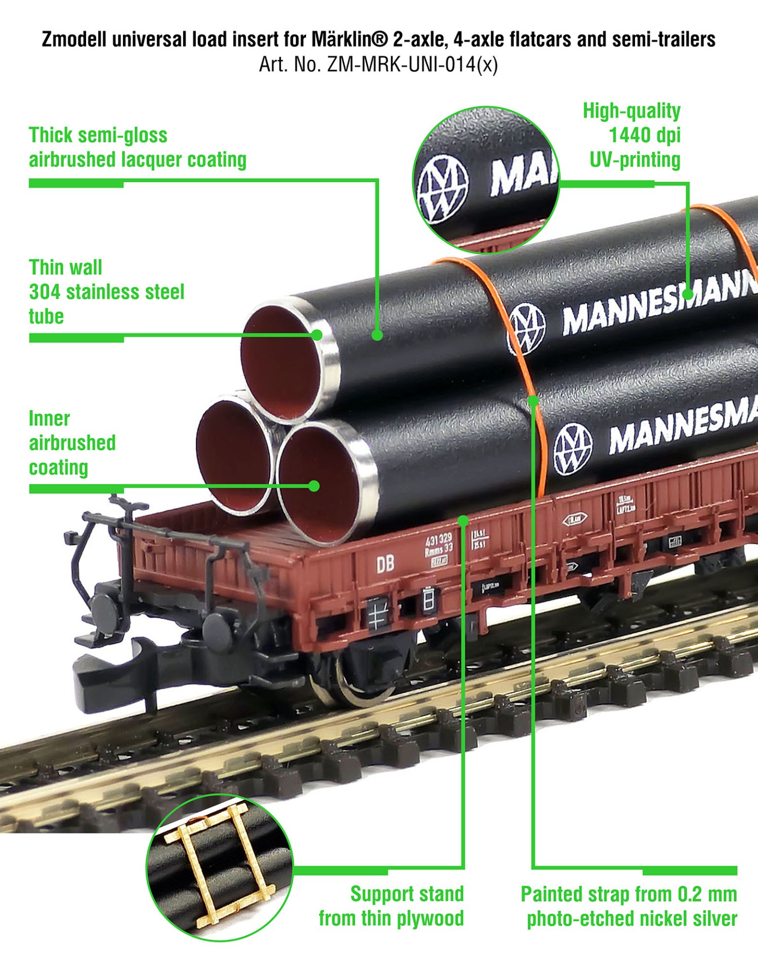 It is also worth noting that the new loads are suitable to the long 4-axle flatcars, too - two of them are needed in this case. In addition, it is also possible to use then with semi-trailers from Märklin, Noch and Herpa. Three different variants available: "Mannesmann" (Art. No. ZM-MRK-UNI-014A), "Hoesch" (Art. No. ZM-MRK-UNI-014B) and "Thyssen" (Art. No. ZM-MRK-UNI-014C).