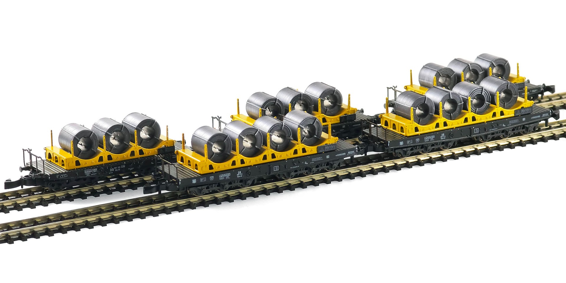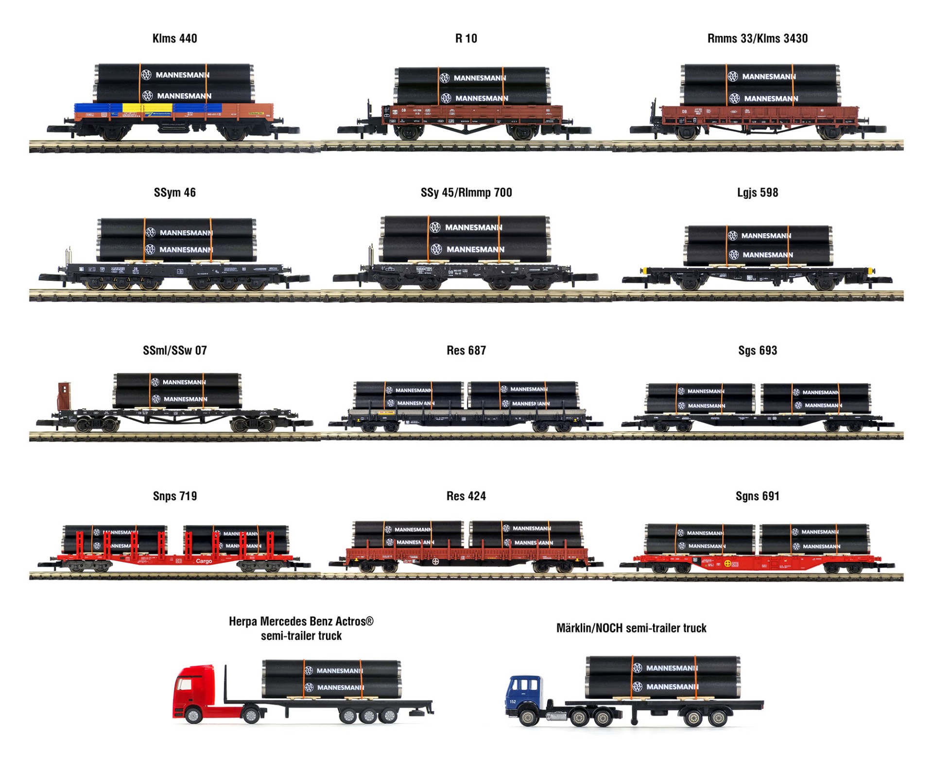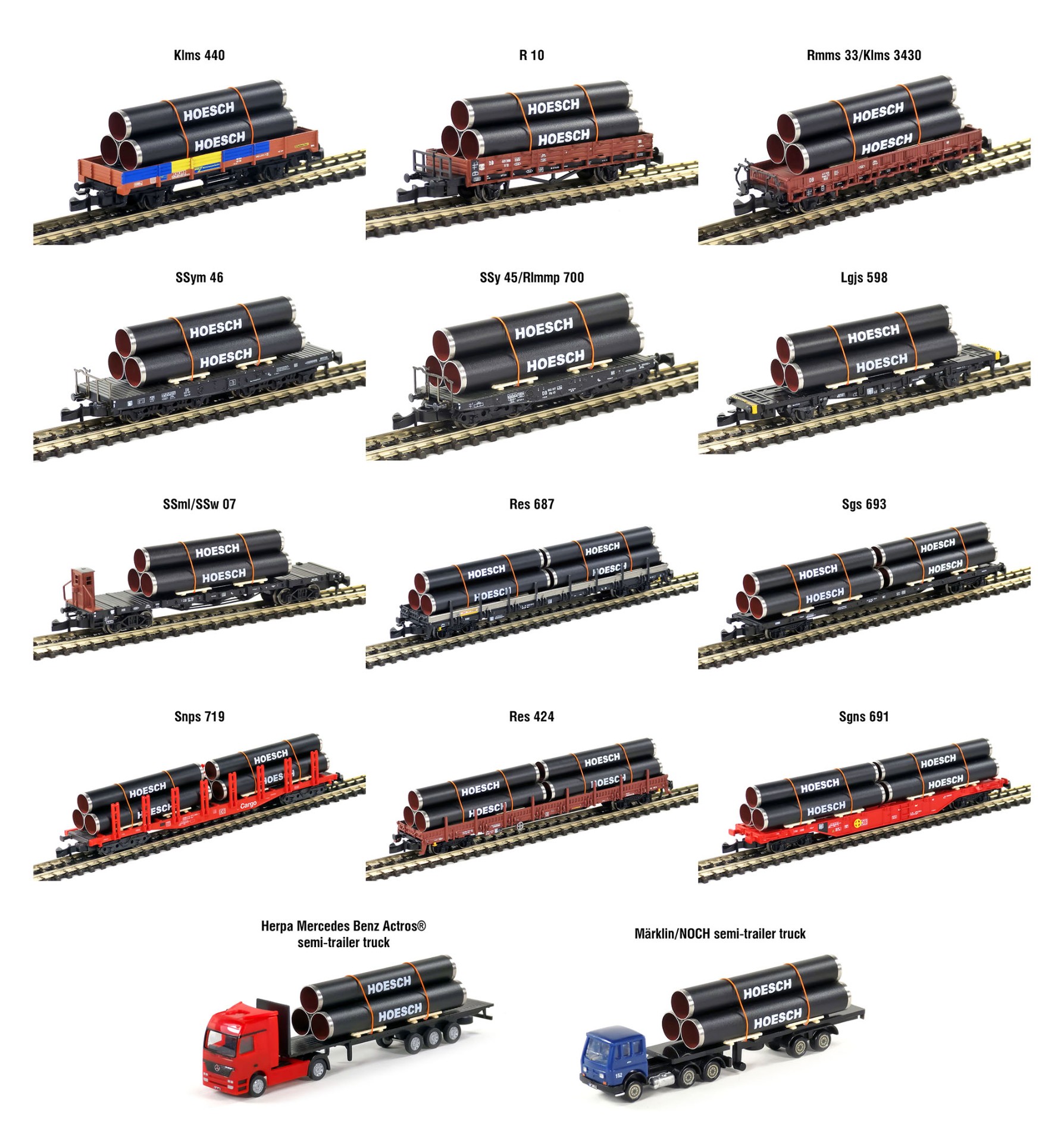 It is also worth noting that the new loads are suitable to the long 4-axle flatcars, too - two of them are needed in this case. In addition, it is also possible to use then with semi-trailers from Märklin, Noch and Herpa. Three different variants available: "Mannesmann" (Art. No. ZM-MRK-UNI-014A), "Hoesch" (Art. No. ZM-MRK-UNI-014B) and "Thyssen" (Art. No. ZM-MRK-UNI-014C).