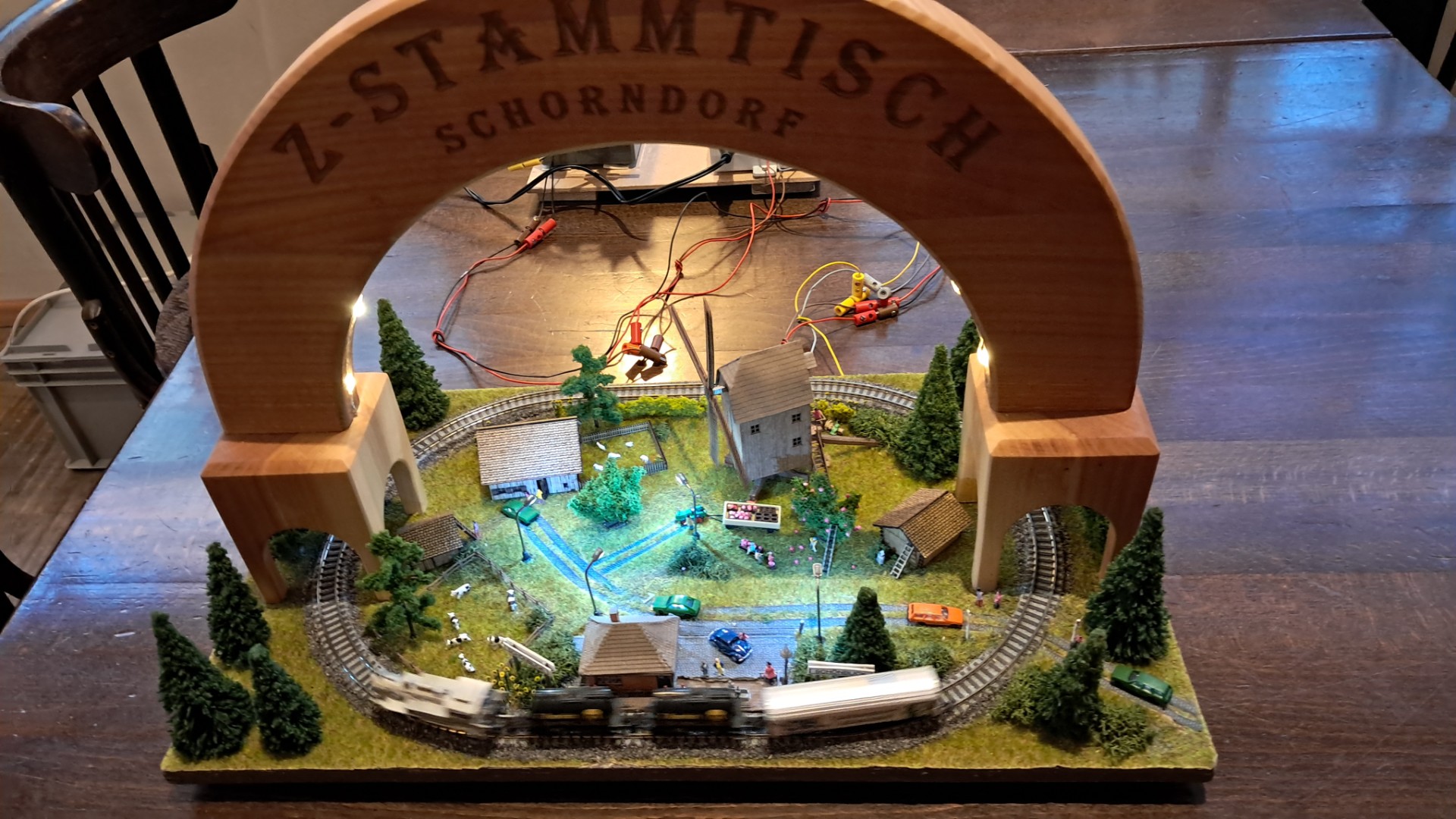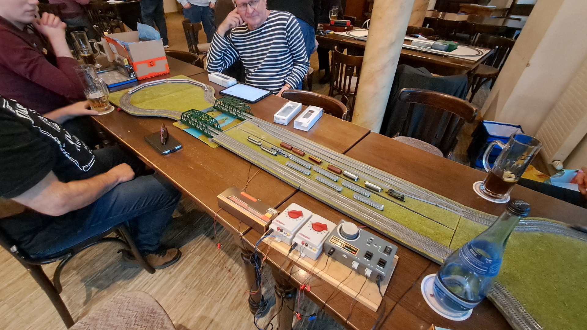 die meisten dürften jetzt wieder zuhause sein. Heute waren ca. 20 Leute da, gezählt habe ich sie nicht (also unzählige?). Vor lauter Leute zählen und schauen, was es so gibt (Doehler&Haass-Programmer, MS2-Update, lange Züge, Arduinosteuerung, Popkulturwagen, Schienenbussound, schweren Zügen, Autos,...) habe ich heute nur ein Foto anzubieten. Um ein Video zu erstellen fehlt mir momentan die Zeit.