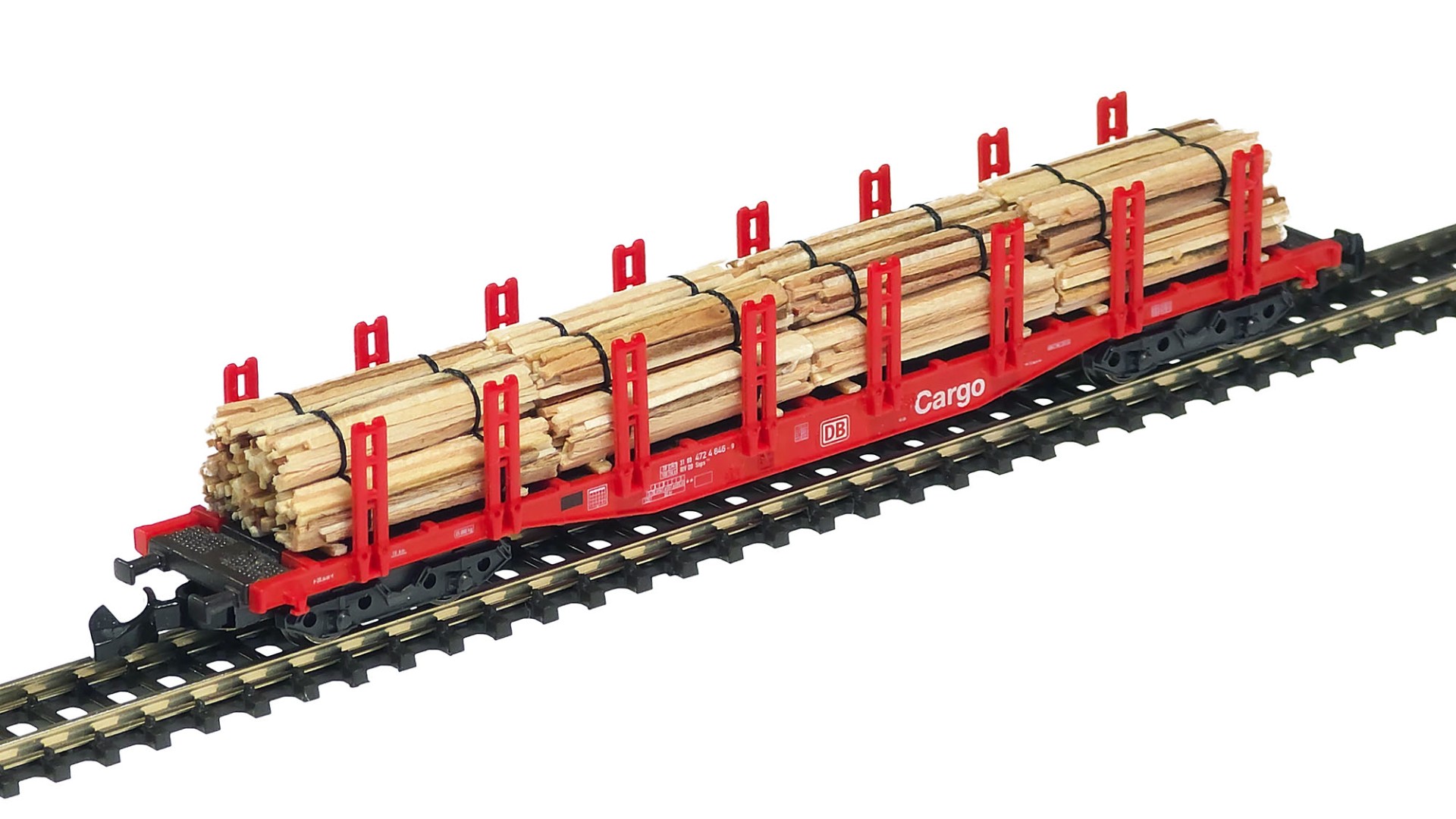 This load insert fits only one type of 4-axle flatcars - DRG SSml/DB SSw 07. In order to prevent the load insert from sliding during motion, stakes (12 pieces) must be installed on the flatcar. They come in the package with the model: