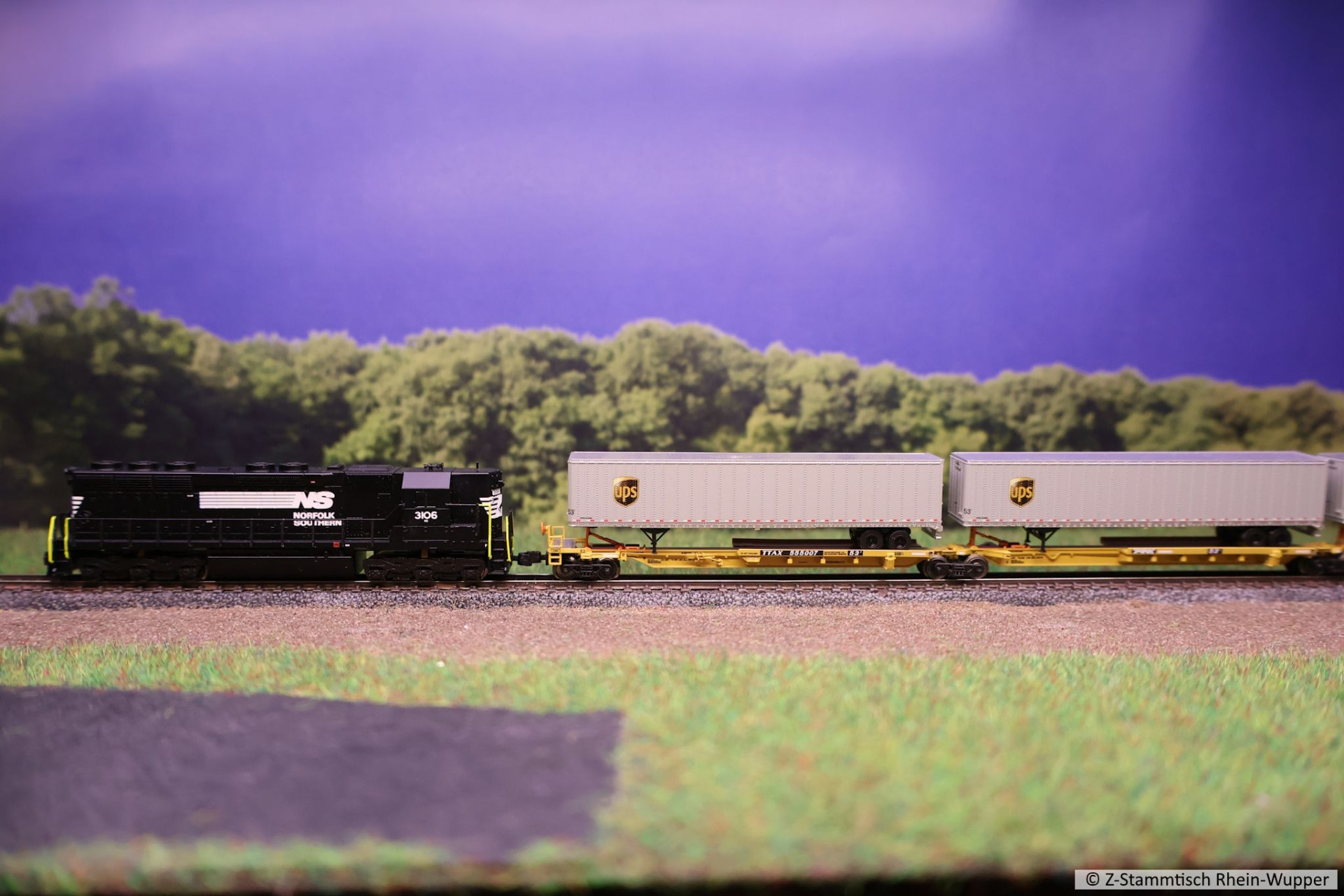 Zum Abschluss des Abend hat eine SD45 der Norfolk Southern sich mit Spine Cars auf die Gleise begeben