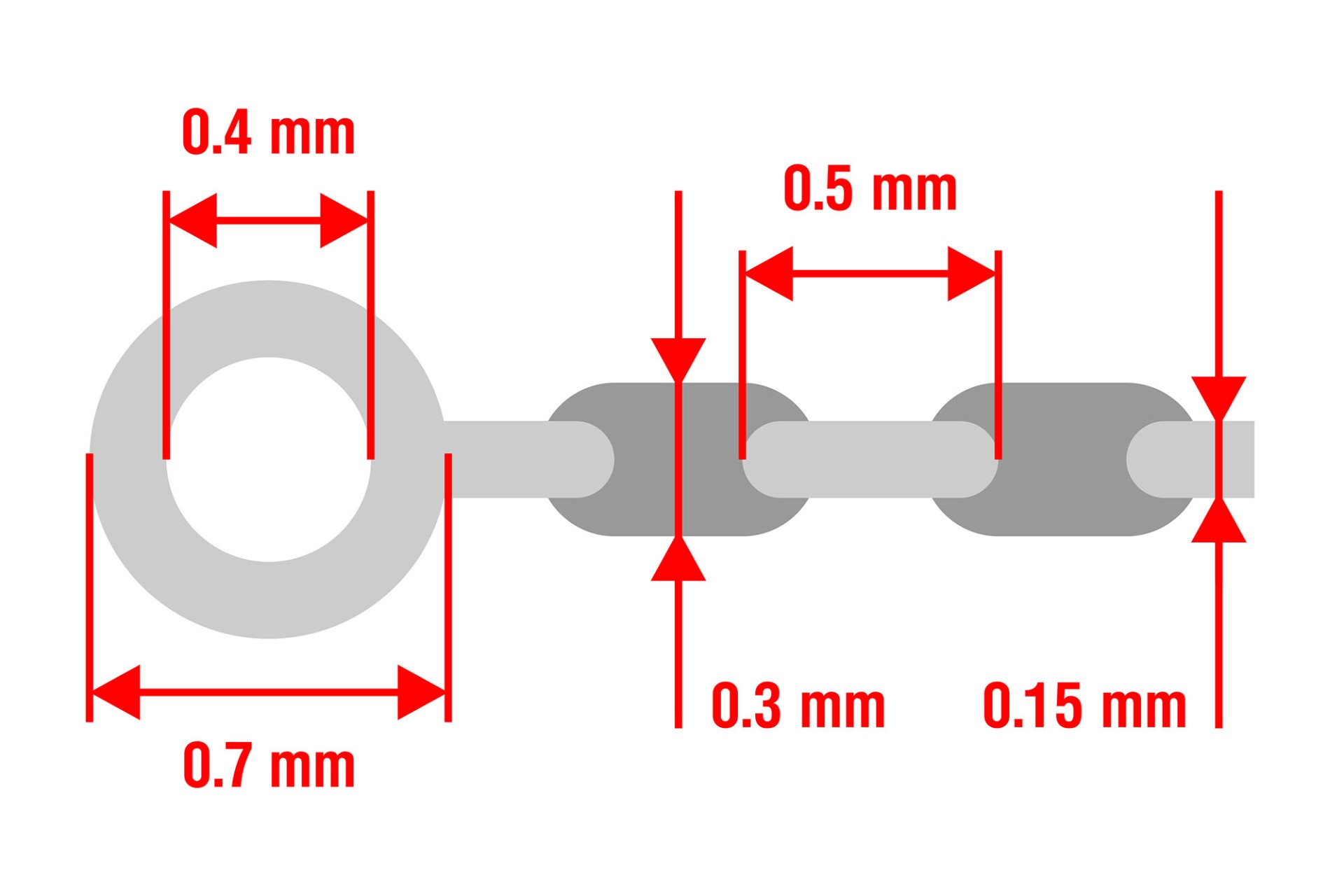 The new chains are only 0.3 mm wide – 40% narrower than the old ones and can therefore find even wider application in Z scale due to their even greater proximity to the prototype dimensions. The same material is used – 0.15 mm CuNi19 copper-nickel alloy. Here is a drawing that shows detailed dimensions of the new chains:
