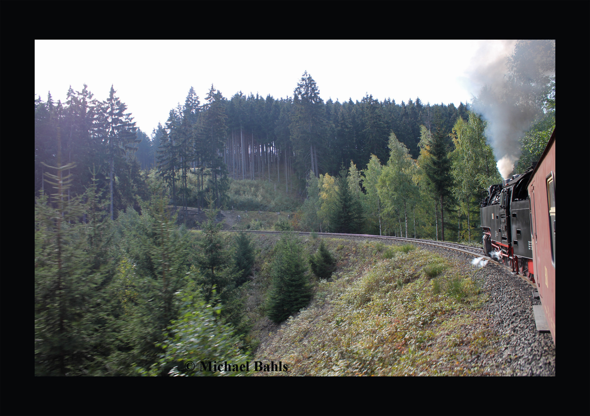 Das Wesentliche aber ist die eigentliche Fahrt. Das ist ein akustisches Erlebnis, das wohl so auf keiner anderen Deutschen Schmalspurbahn zu erleben ist. Die Loks müssen ihr Äußerstes geben. Ich bin schon oft mitgefahren, habe aber auf den Bergfahrten niemals im Wagen gesessen, sondern immer auf der ersten offenen Bühne gestanden. Die Fahrt ist so kurvenreich mit engen Radien, daß Du aber auch von jedem Fenster aus die Lok zu Sehen bekommst und auch die Zugkreuzungen sind zumeist mit Dampf. Trau Dich! ;)
