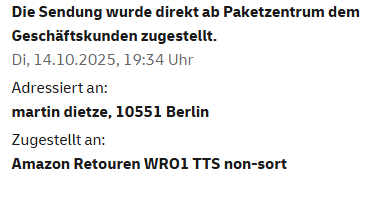 großer Versandhändler, Ware bestellt, 2 Artkel. Ich bekomme eine Sendungsankündigung in der DHL-App. Prima. Am nächsten Tag eine Zweite, auch von dem Versender. Hmm, warum? Im Account nachgesehen: ja wird in 2 Paketen geliefert. OK. Am dritten Tag bekomme ich morgens eine dritte Tracking-Nr. und am Abend noch eine - also 4 Stck.