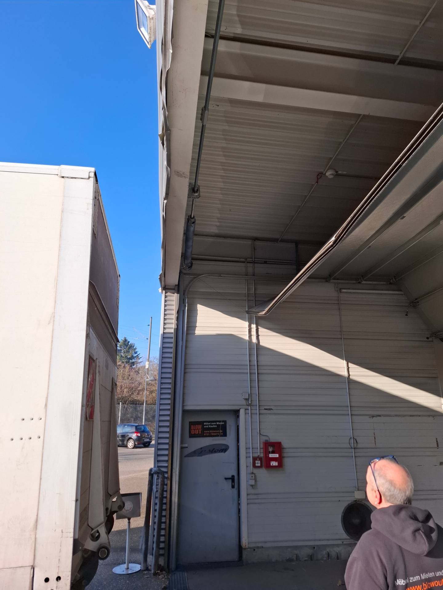 Alle standen drumherum, auch ich als junger Projektleiter und erst mal ein dummes Gesicht gemacht. Da kam einer auf die Idee die Luft (nicht komplett) aus den Reifen zu lassen. Gesagt, getan. Hat absolut "knirsch" funktioniert. Draußen wieder aufgepumpt und der Tag war gerettet.