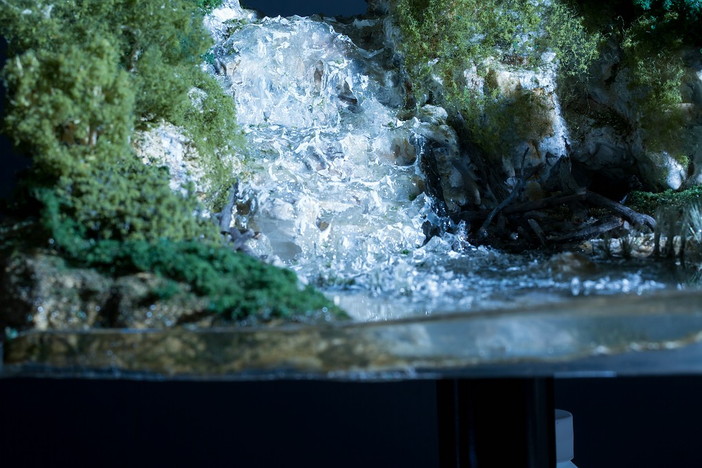 Was auch vielleicht interessant ist: es gibt von Woodland scenics eine Art Harz, was man gut als Wasser verwenden kann. Das Ganze ist eine Einkomponentenlösung, die auch für die Bearbeitung fließt und auch einfärbbar ist. Außerdem haben die eine Art Folie, die aus zwei Schichten besteht. Hinten ist so eine Art Alufolie drauf, vorne eine Art weißes Papier. Das ganze dementsprechend geknittert und dann mit Gips angestrichen kann als Felsen dienen.