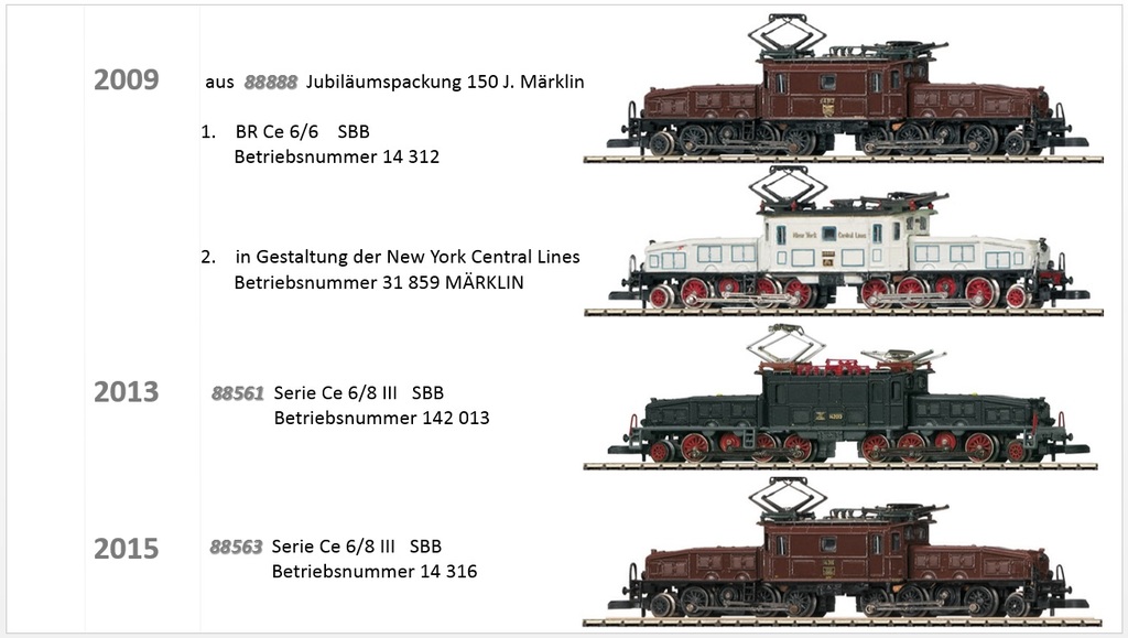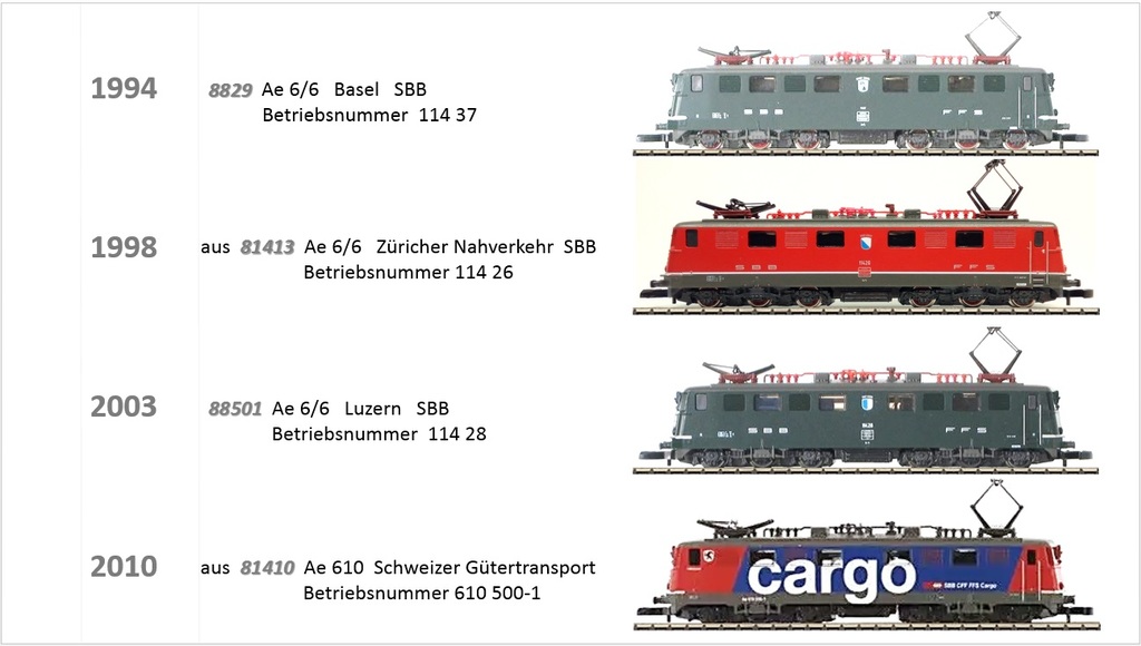 Die Jahresangabe in meinen Zusammenstellungen ist das Jahr, in dem der Artikel als Neuheit im Katalog erschienen ist. Ob die Loks dann wirklich in dem Jahr oder später und über längere Zeit produziert wurden entzieht sich meiner Kenntnis. Z.B werden die restlichen Kittel wahrscheinlich erst Ende 2019 fertig produziert, waren eine Neuheit von 2016 und ein erster Teil wurde erst 2018 produziert bzw. ausgeliefert