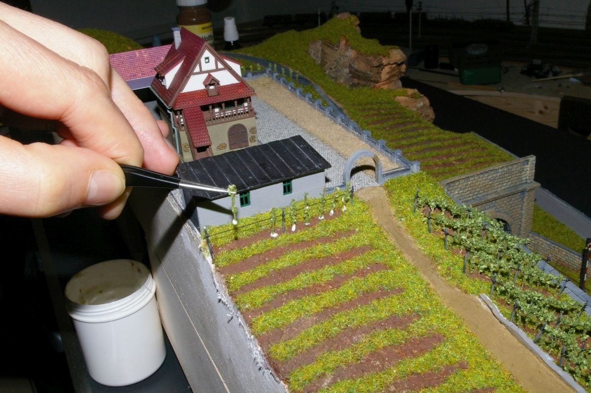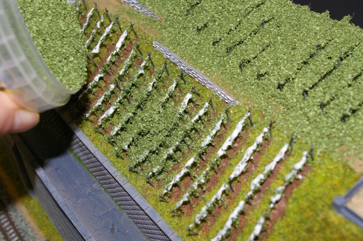 Das was an der Pincette hängt, ist in Holzleim getränkter brauner Zwirn, der anschließend durch das Laub gezogen wurde. Dann werden die zu hohen Reben noch mal gestutzt, mit Holzleim bepinselt und mit Laub zu geschüttet.