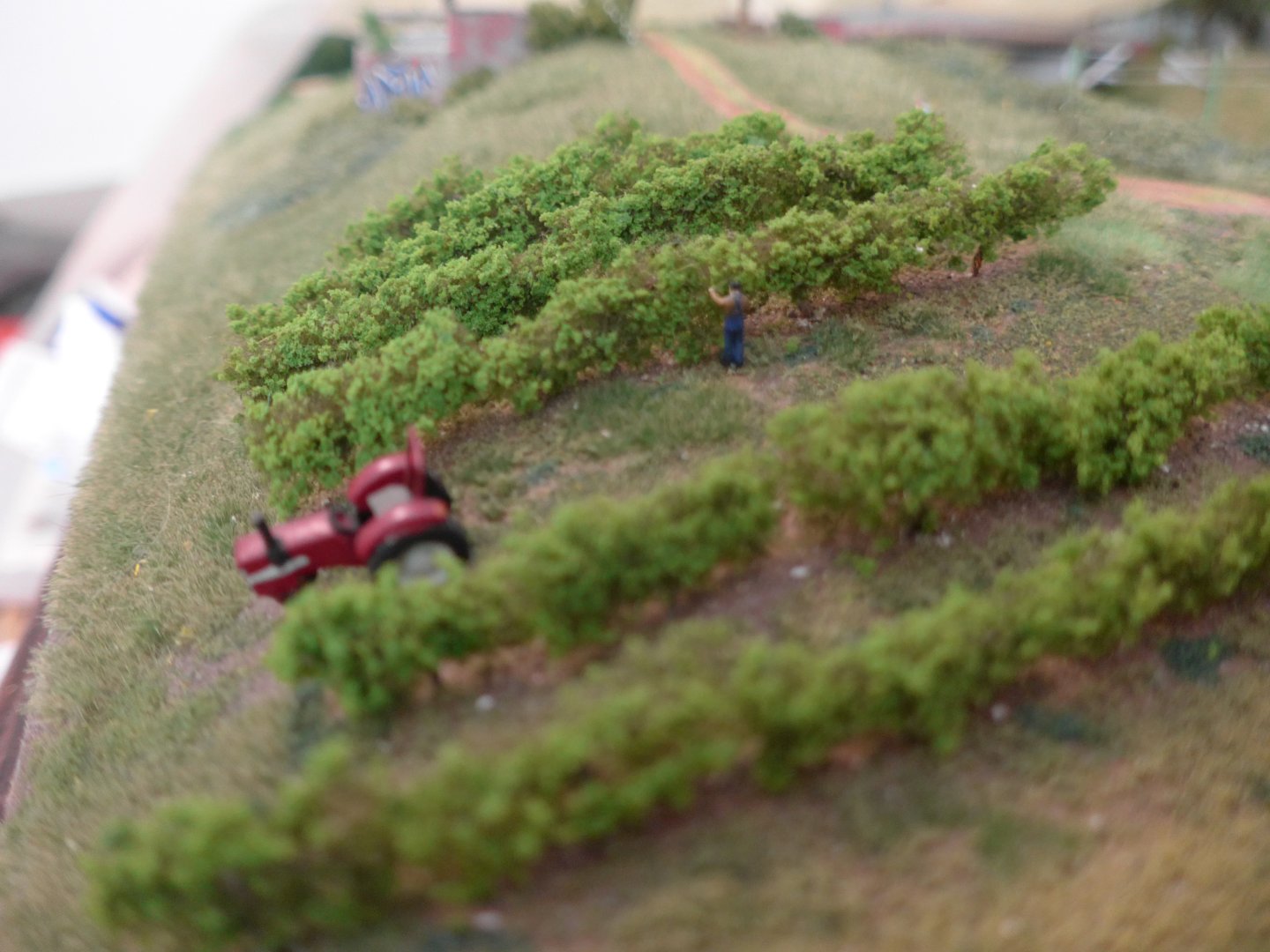 Auch Eigenbau. Aus mehreren Drähten einen Stamm mit zwei Ablegern gedreht. Ergibt T-Form und dann angemalt. Abschließend mit Heki beflockt. Alle dann einzeln gepflanzt.