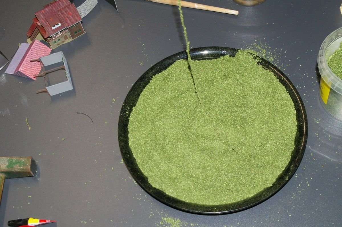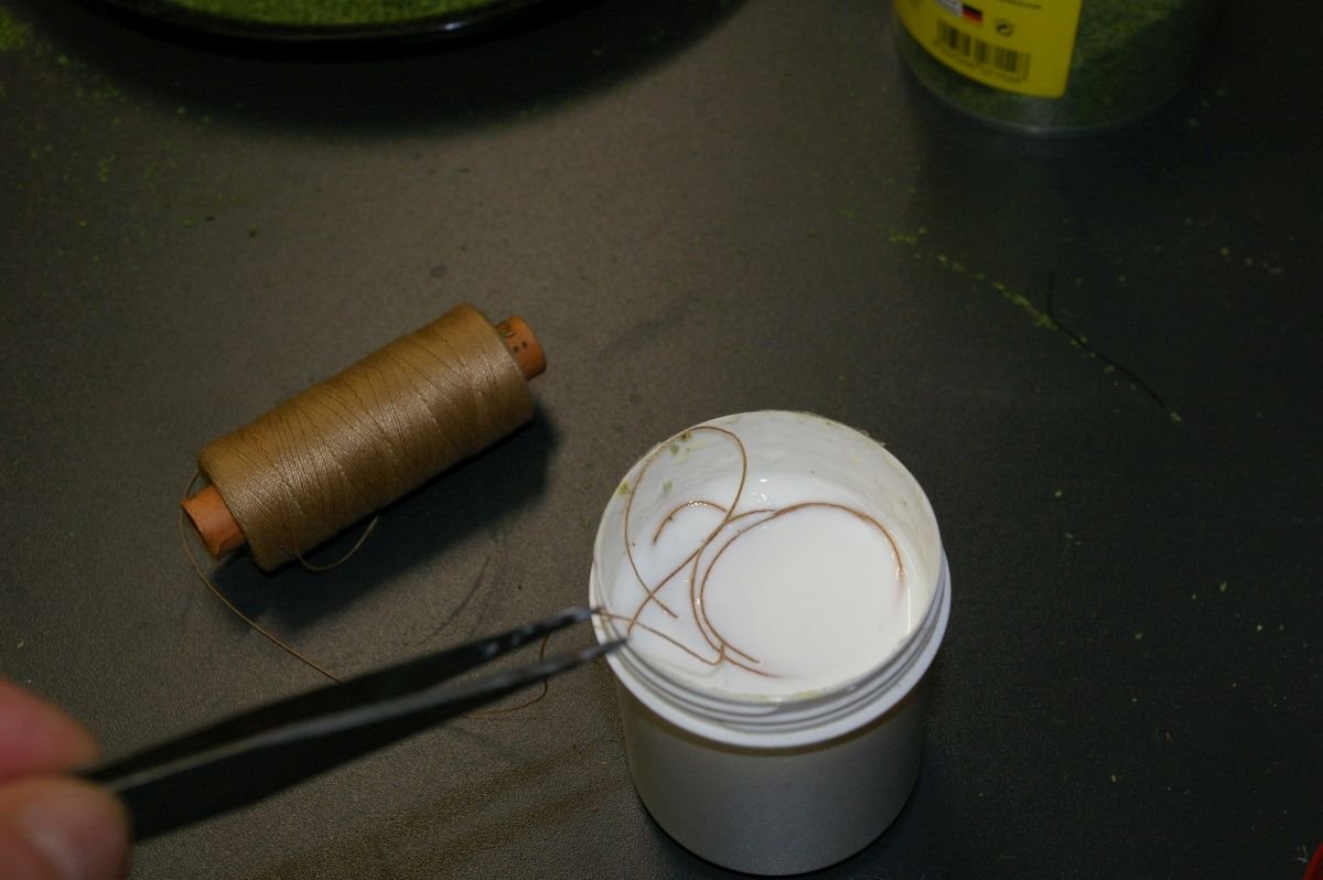 Man benötigt Stecknadeln, braunen und schwarzen Zwirn, Holzleim (mit Wasser gemischt) und Noch Laub mittelgrün (07154).