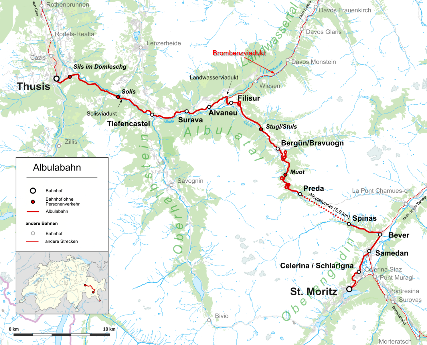 Das Brombenzviadukt ist zwar eine schöne Brücke, befindet sich aber überhaupt nicht an der Albulabahn, sondern an der Strecke Davos - Filisur. Der genaue Streckenabschnitt wird ja im Text sogar erwähnt. Karte zur Veranschaulichung (Wikipedia, bearbeitet)Die „Brombenzviadukt“ oder auch „Landwasserviadukt zwischen den Zügen“ genannte Eisenbahnbrücke befindet sich auf der Strecke zwischen Davos Monstein und Davos Wiesen. Sie ist eines der prägnantesten Bauwerke der Albulabahn und entstand zwischen 1908 und 1909. Mit einer Länge von über 40 Metern überspannt sie auf einer Höhe von über 20 Metern das Landwasser und eine Straße.