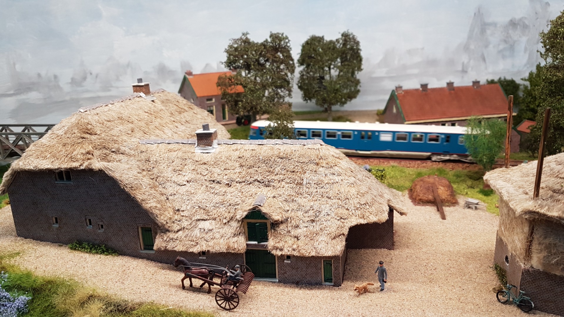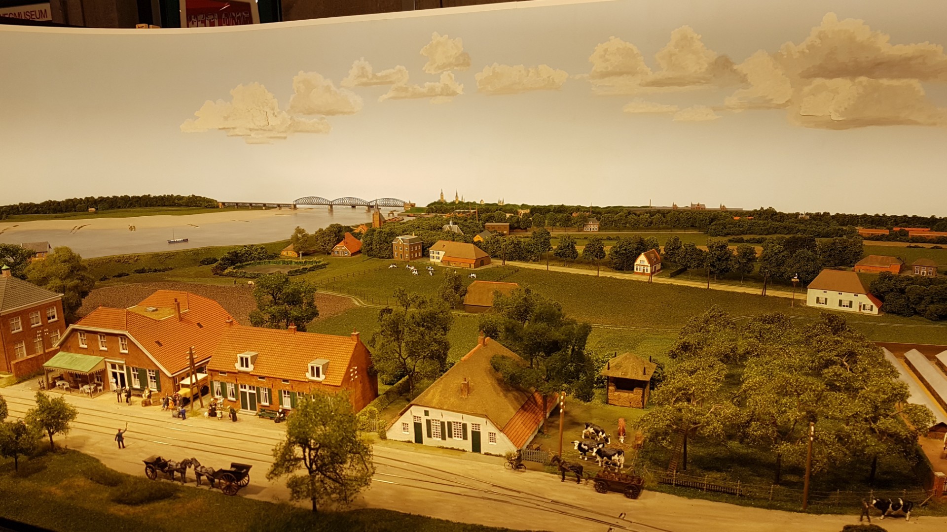 Auf der Anlage Rijk van Nijmegen wird dadurch eine unglaubliche Anlagentiefe simuliert, indem drei Spurweiten mit den gleichen Darstellungen des Zuges hintereinander sichtbar werden.