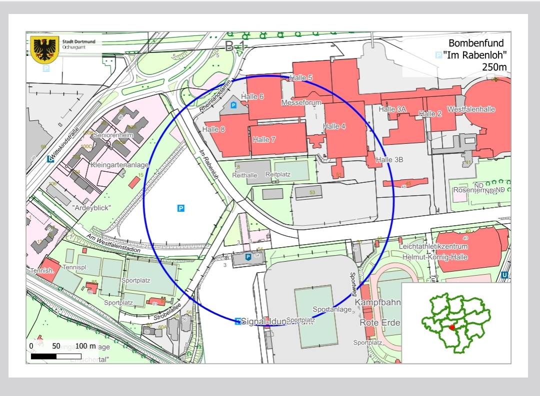Zum Evakuierungsradius zählen unter anderem die Hallen 3, 4, 5, 6, 7 und 8, der Parkplatz A8 sowie weitere angrenzende Bereiche, darunter die Straßen Strobelallee, Im Rabenloh und Rheinlanddamm, der SIGNAL IDUNA PARK und umliegende Flächen.