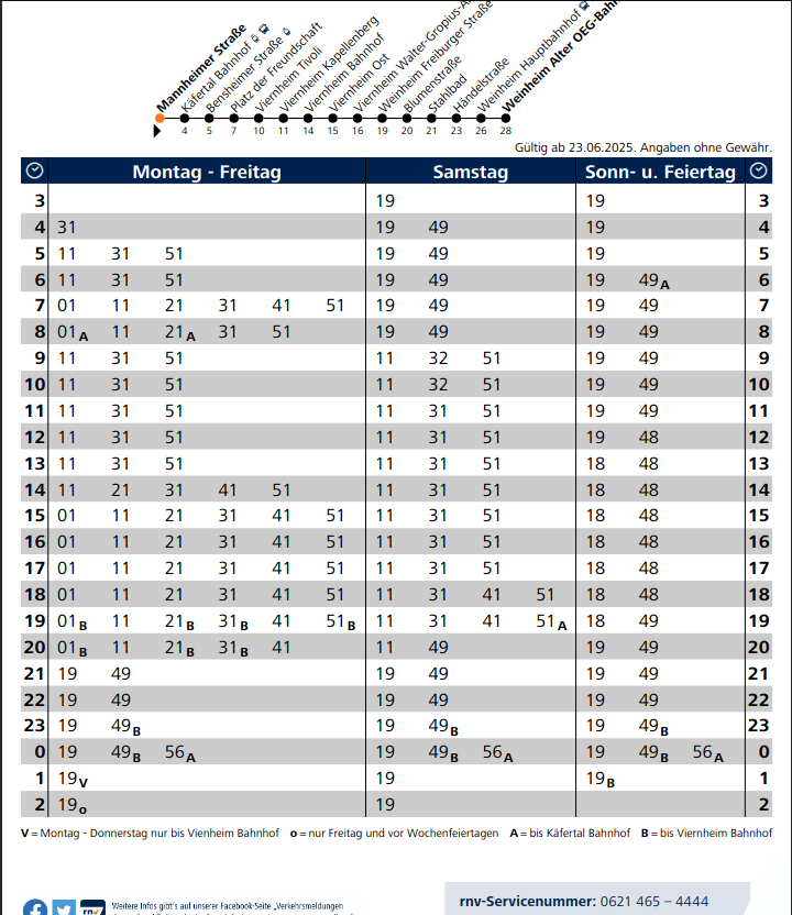 Cozy, die OEG (Linie 5) fährt nachts nicht durch, sondern wird in Mannheim "gebrochen". Dazu kommen verschiedene Umleitungen, da ein kurzes, aber zentrales Streckenstück in der Innenstadt erneuert wird (Hst. Rosengarten). Dadurch ergibt sich mit der sonst nicht genutzten Haltestelle "Kurpfalzbrücke Ost" eine elegante Umsteigemöglichkeit Richtung Weinheim, z.B.:
