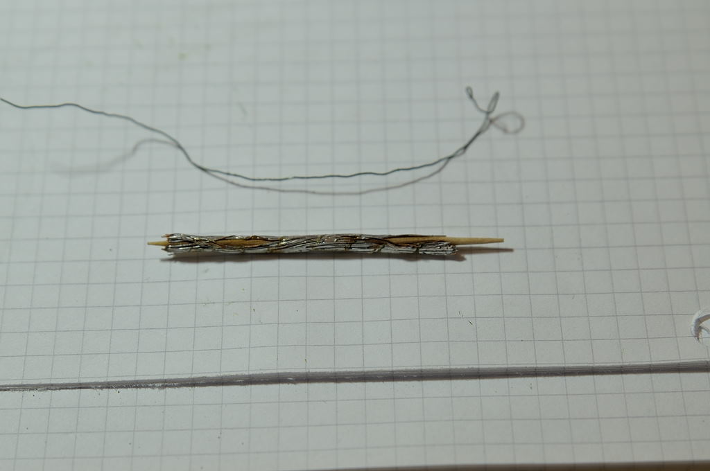Im Kupferdraht ein Zahnstocher einbinden und mit grünen Gärtnerdraht fixieren, nicht zu fest sonst bekommt den Zahnstocher nicht mehr raus. Lücken schon vorformen z.B. mit Uhrmacherschraubendreher und durchgängig verlöten danach den Gärtnerdraht entfernen ein Ende vom Zahnstocher in ein Schraubstock einspannen und versuchen den "Stamm" mit einer Zange abzuziehen. Geht das zu schwer, mit einem Lötkolben mit großer Spitze viel Hitze draufgeben bis es ein wenig an zu rauchen anfängt und dabei am Stamm ziehen, jetzt sollte sich der Stamm abziehen lassen Als nächstes grundiere ich das mit stark verdünntem HEKI Betongrau 6600 als Haftgrund. Farbe nach Wunsch der Baumart auftragen. Wer möchte kann die Rindenstruktur eines Baumes nach bilden. Sandfreie Paste auftupfen, dabei die Löcher nicht zu spachteln, halb trocknen lassen und durch die Paste kratzen (aus einer Drahtbürste 3-4 Drahtenden in einen Pinselstiel stecken, fertig ist ein "Federbesen" zum Rinde modellieren)