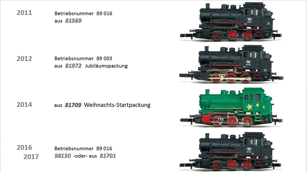 es war eigentlich von mir beabsichtigt bei "ich suche" alle Fakten zu sammeln und dann in einem neuen Strang eventuell auch unter "Ankündigungen und Neuigkeiten" die fertige Zusammenstellung der BR89 Modelle in den nächsten Tagen zu posten, aber so geht's auch