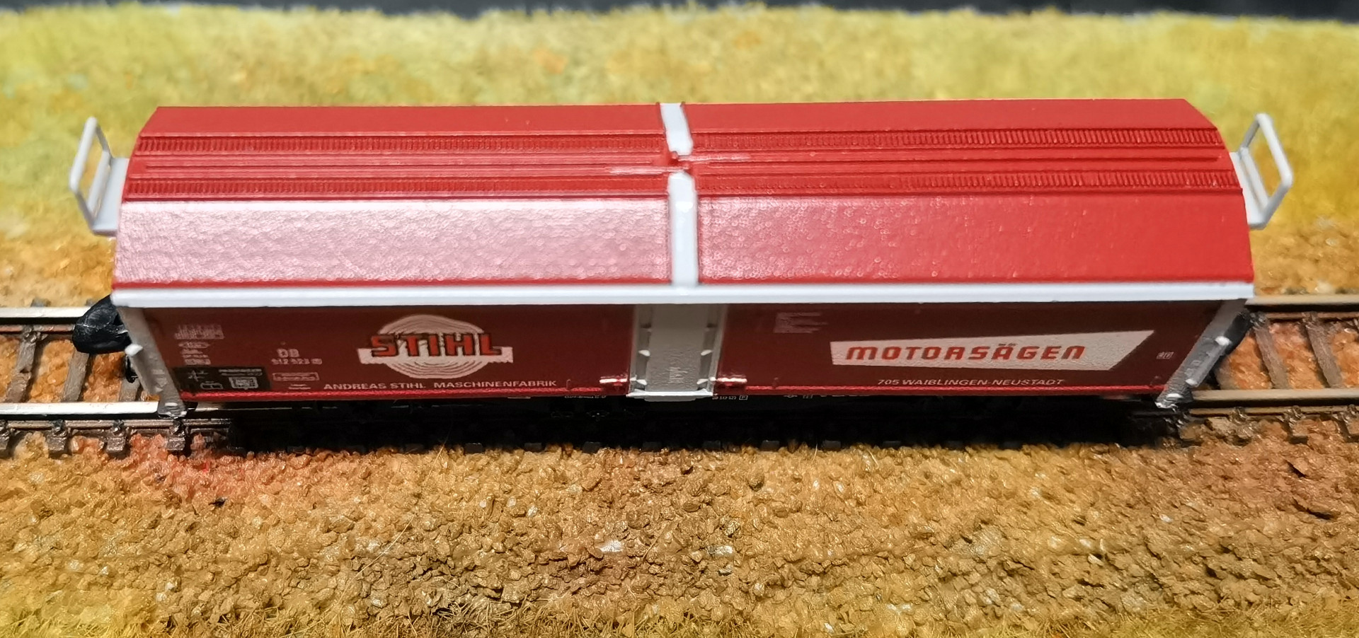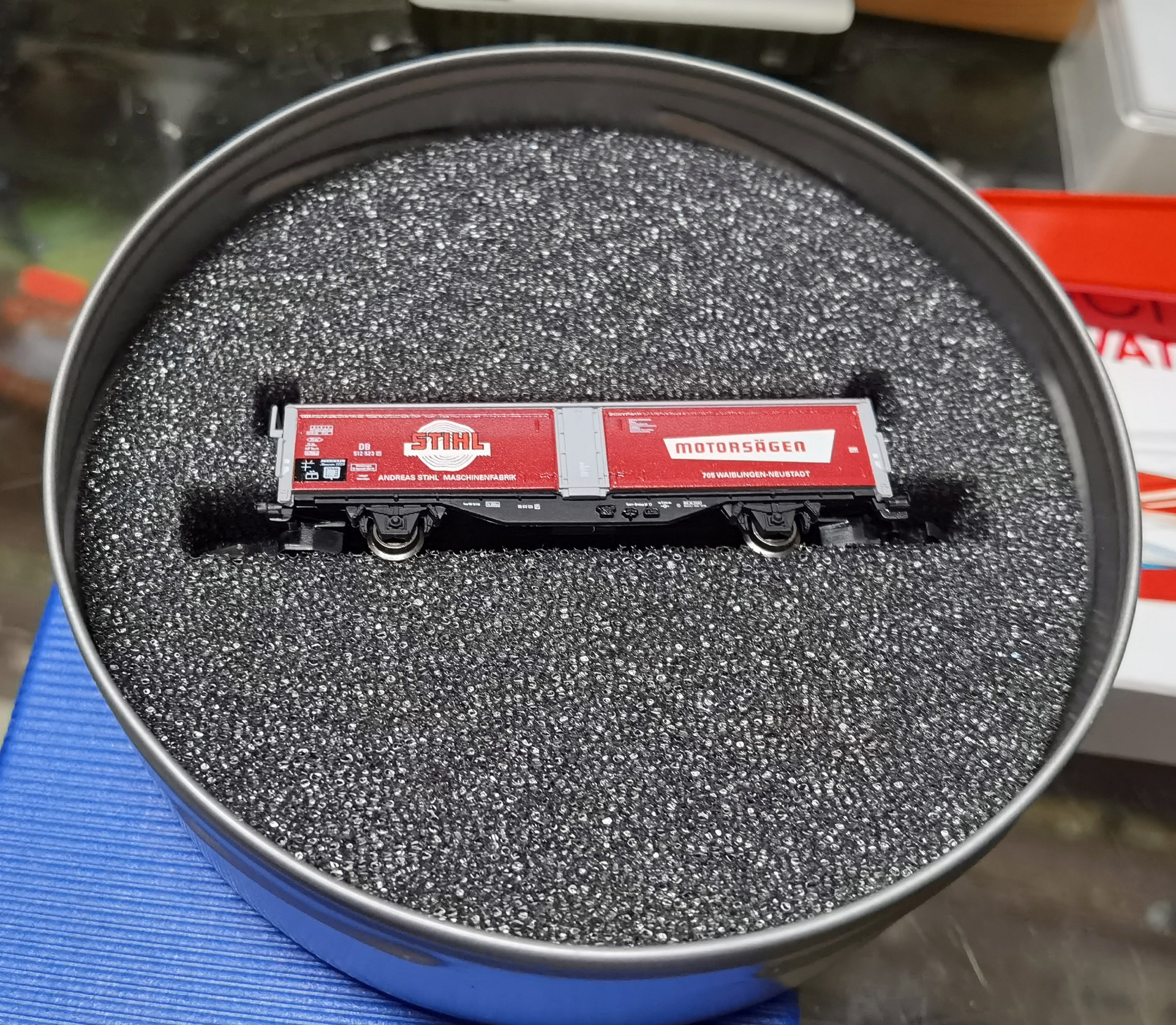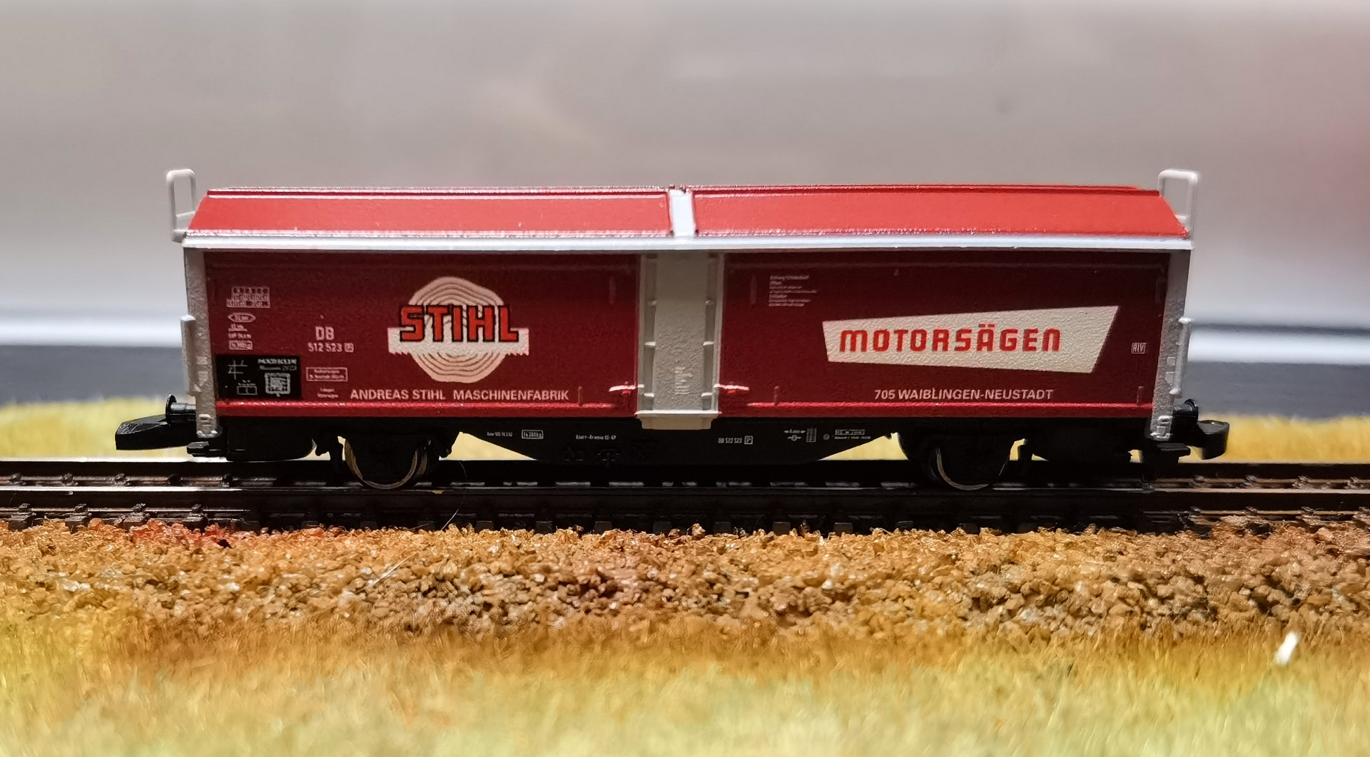 Auch wenn diese gesponserten Wagen nicht den Anspruch erheben, nach einem Vorbild gestaltet zu sein, so wäre es doch schön, wenn Produkt und Waggontyp irgendwie zusammenpassen würden. Das erschließt sich mir hier nicht. Ein relativ moderner Waggon mit nostalgischer Bedruckung sieht zudem doch sehr gewöhnungsbedürftig aus.