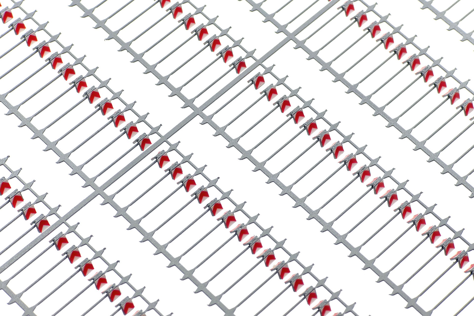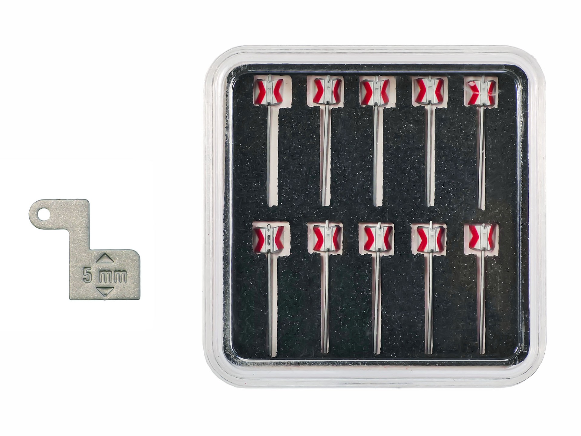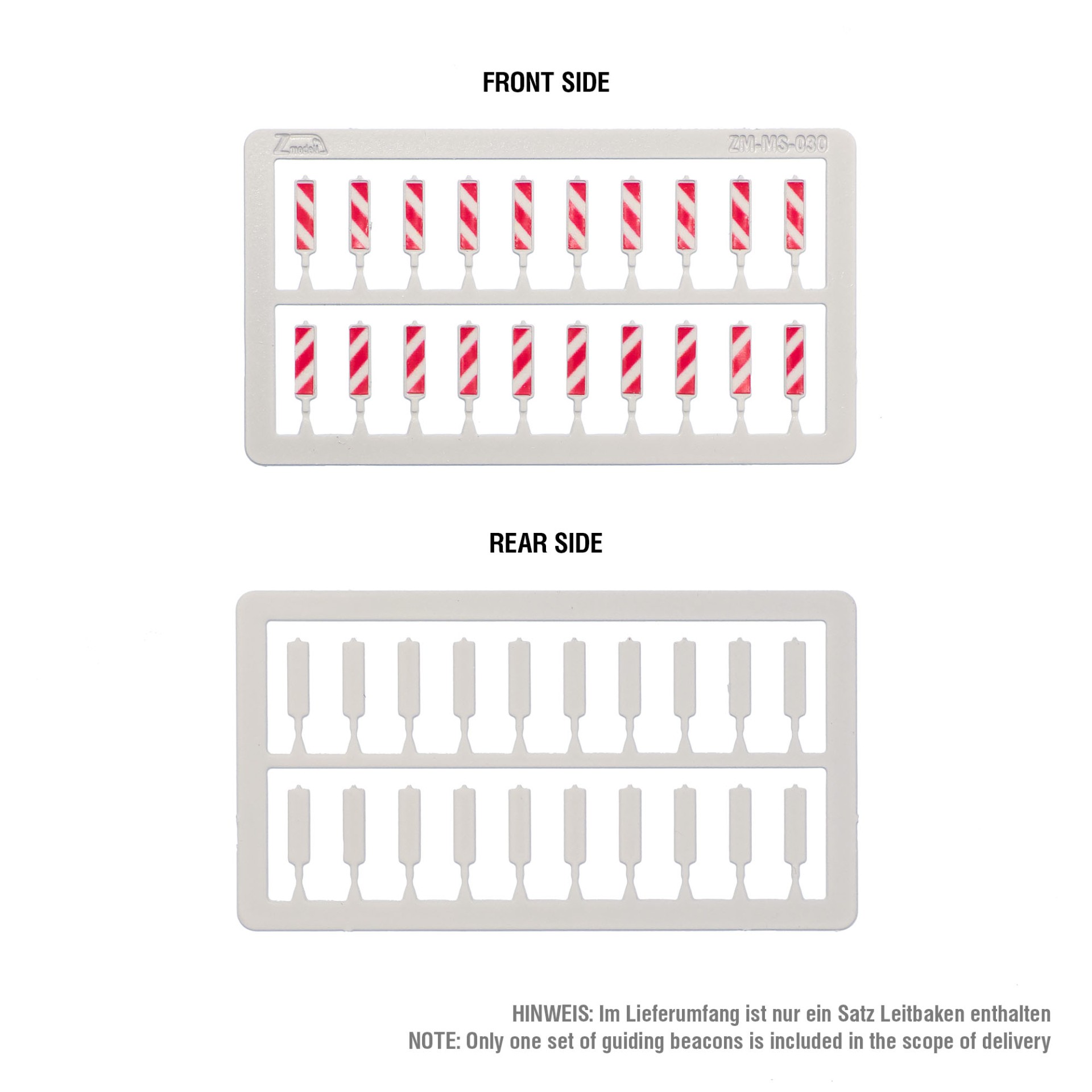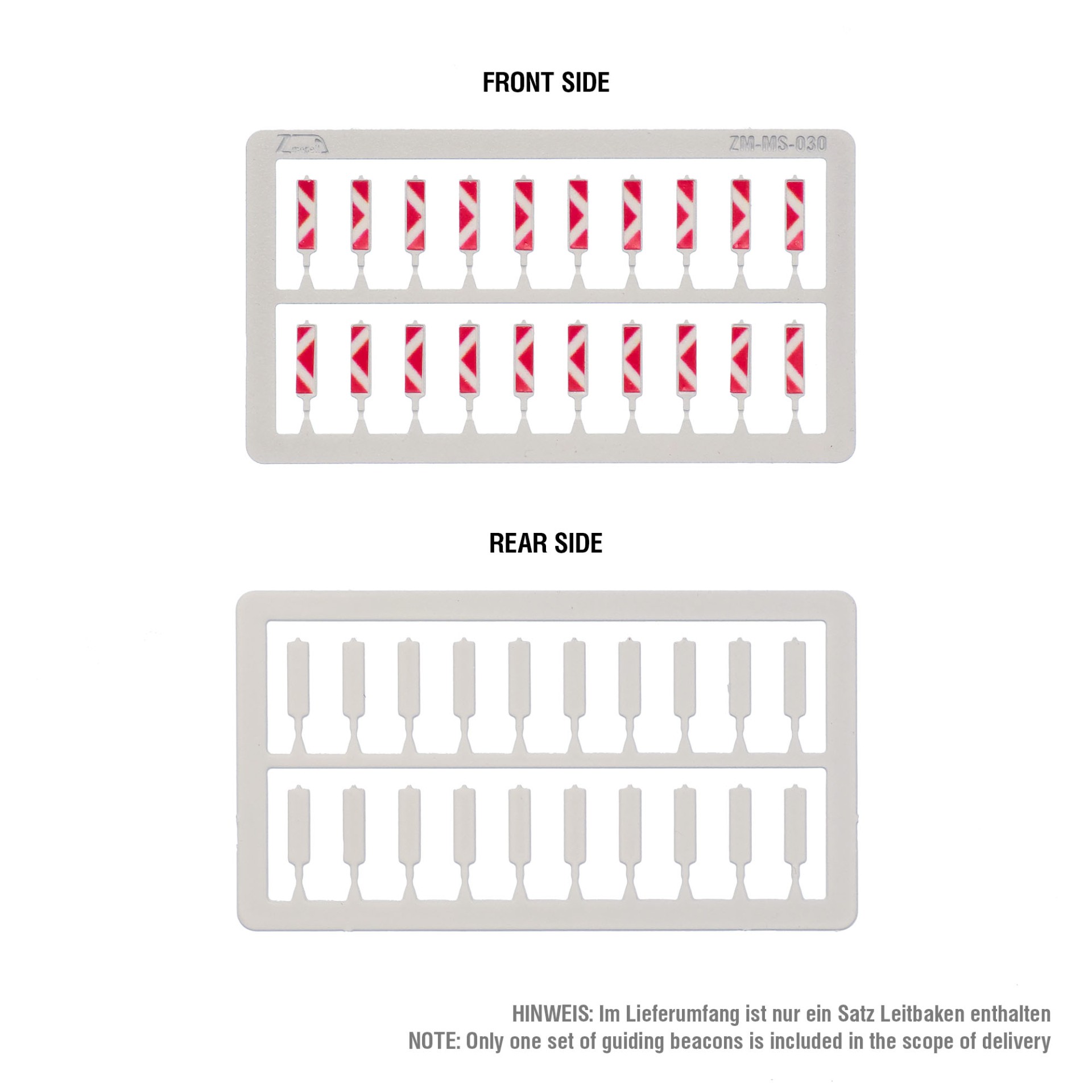 The guiding beacons are made of the same material – 0.3 mm photo etched nickel silver with half-etched elements and separately applied plastic warning stripes. The beacons share the same single footplates used for the road barriers. The only difference is that the beacons must be installed into a different opening – the bigger square one in footplate’s center.