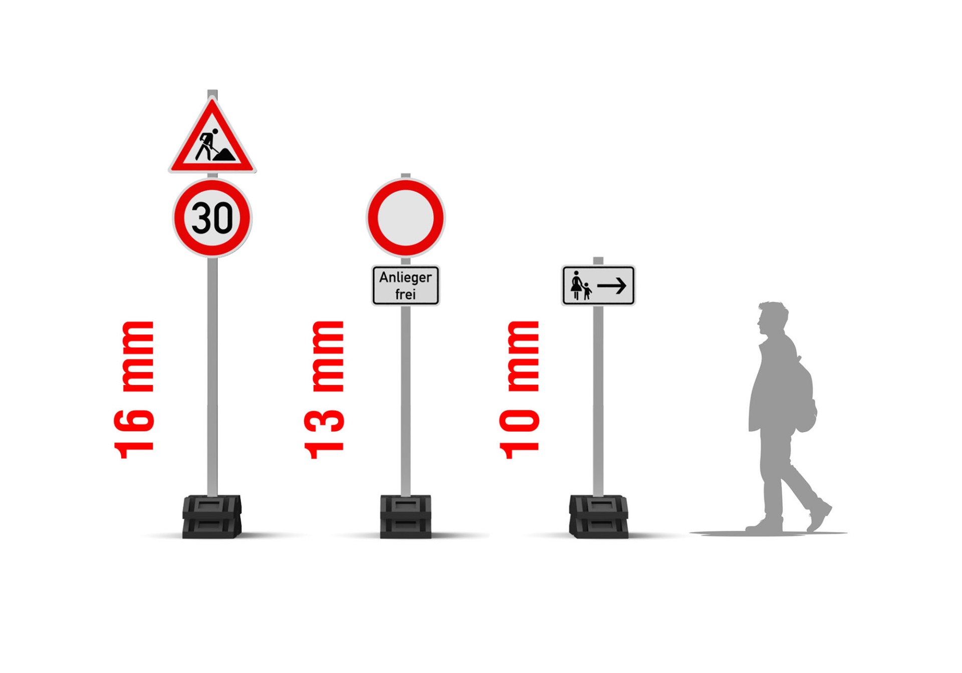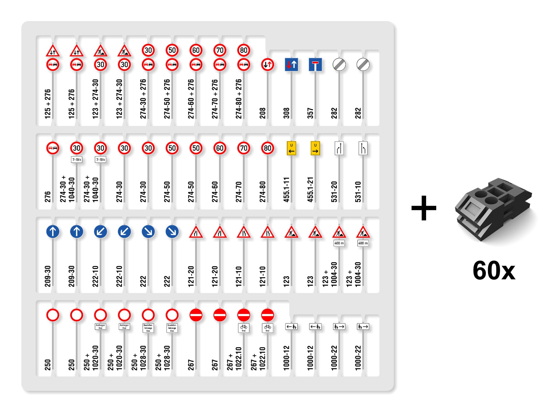Double foot plates are manufactured using high resolution SLA 3D printing technology. I intentionally included 4 spare foot plates in the package in case they get lost or broken. Here is a graphic visualization of the set with road sign numbers according to the latest edition of the Road Traffic Regulations (StVO) of Germany: