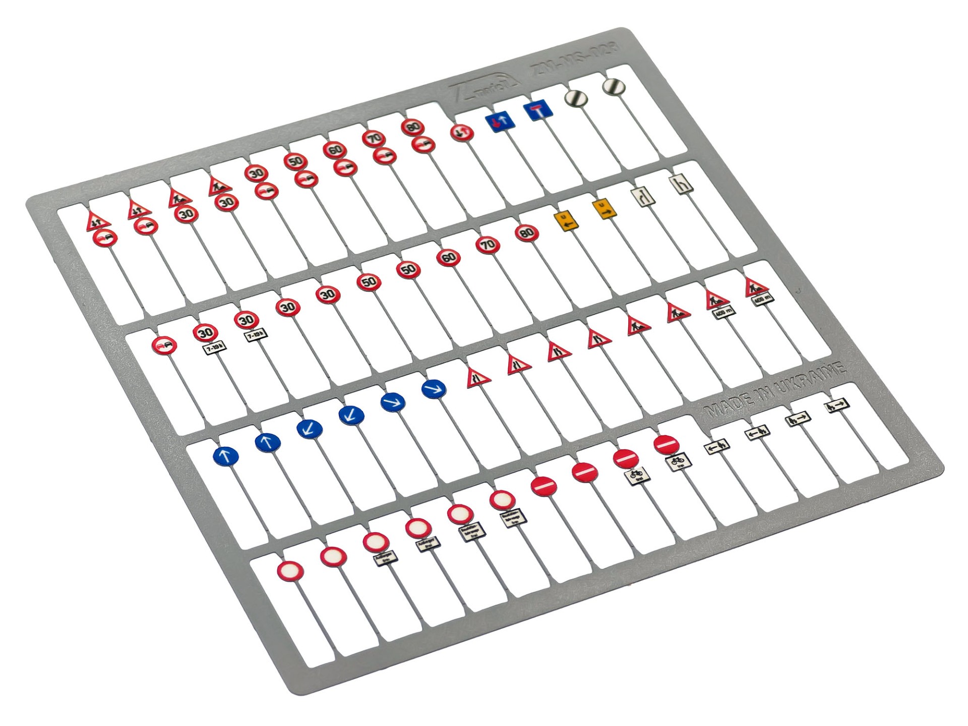 The set consists of 56 traffic signs and supplied with 60 double foot plates. The traffic signs are made of 0.3 mm photo etched nickel silver and feature half-etched elements – the rear sides of sign plates are half-etched. The signs are airbrushed with the same paint composition I used for traffic barriers and feature separately applied plastic stickers with high resolution laser printing.